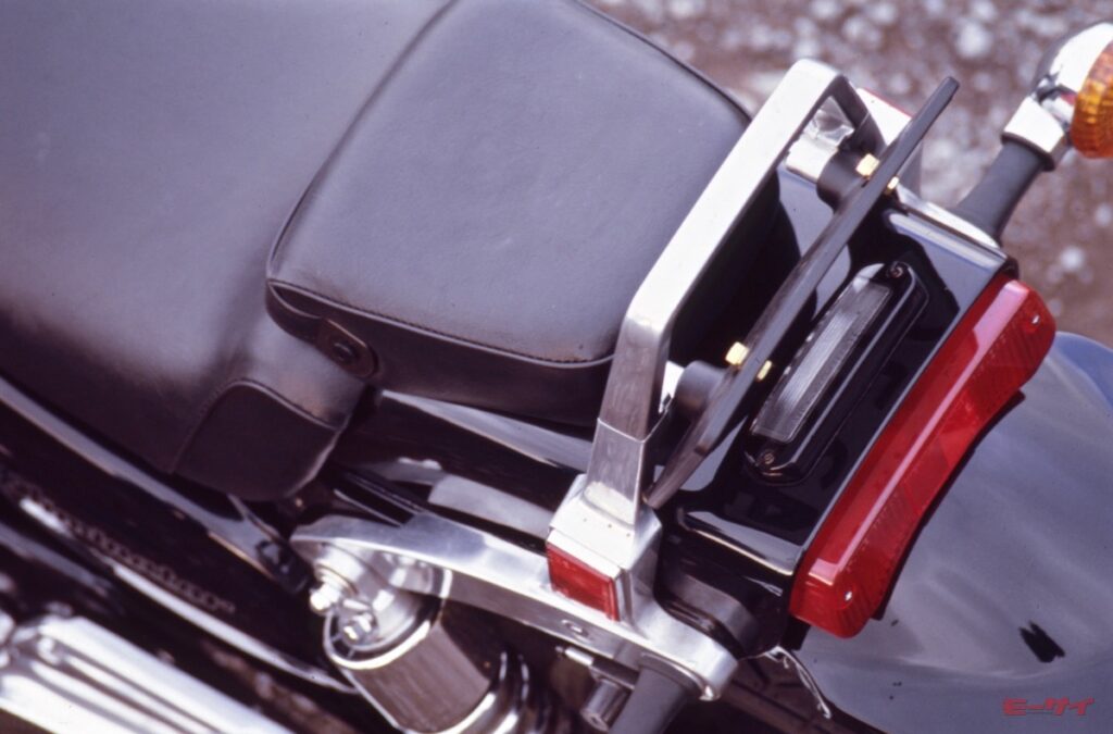 スラッシュカットされたマフラーは左右2本出し。リヤタイヤは(当時としては)超ファットな160/80-15。