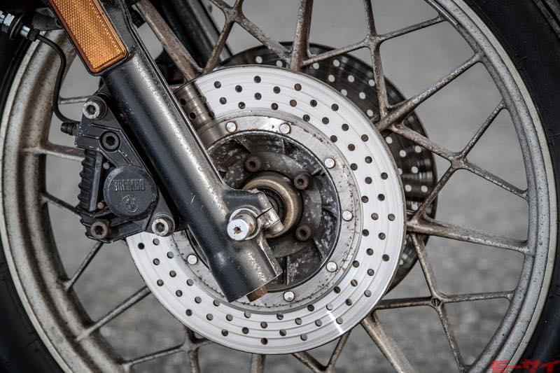 前後ホイールはBMW初のアルミキャストだが、極初期のモデルにはスポーク仕様が存在。当初はアーテだったフロントブレーキキャリパーが、ブレンボに変更されたのは’81年型からで、この年式では同時にリヤのドラム→ディスク化も実施。