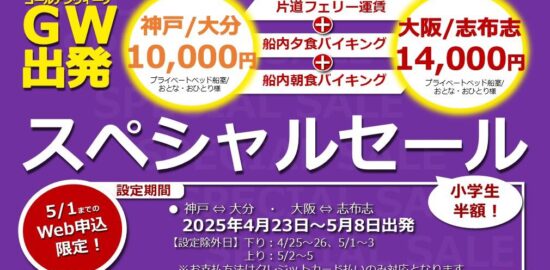 【WEB予約限定】さんふらわあスペシャルセール実施中!「神戸〜大阪」「大阪〜志布志(鹿児島)」のフェリーをゴールデンウイークに楽しもう