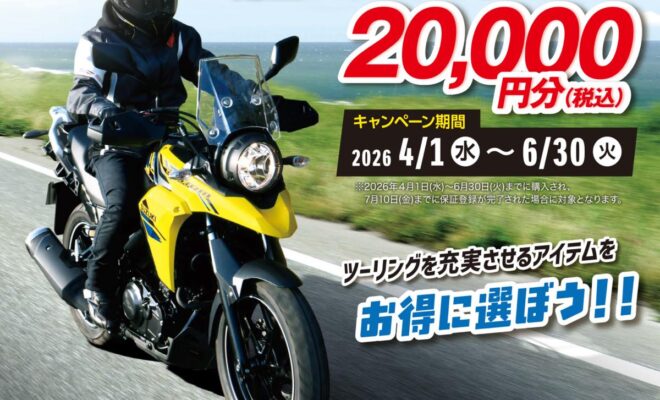 お得にアクセサリーを装着して快適なツーリングを楽しもう!スズキは、2026年4月1日〜6月30日の期間中にキャンペーン実施店にてVストローム250の国内認定新車を購入し、7月10日までに保証登録を完了すると、純正用品の購入に使える…