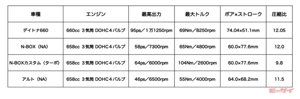 スポーツバイクのトライアンフ・デイトナ660と、軽自動車のホンダ・N-BOX、スズキ・アルトをエンジン性能で比較してみる