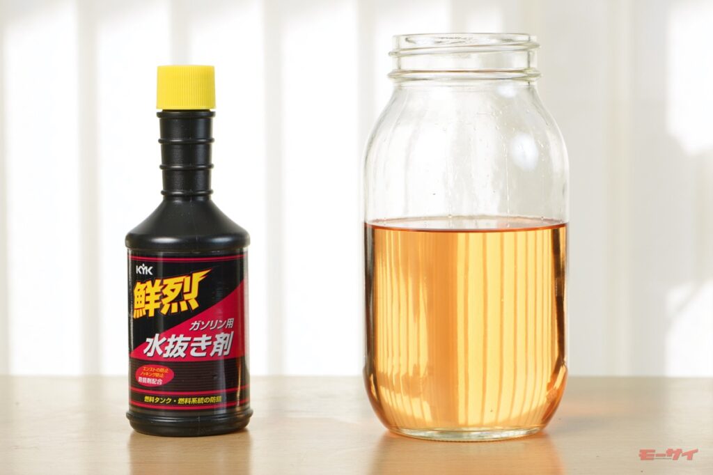 燃料タンクに「水抜き剤」を入れた状態を、ガラス容器で見える化! 水は「除去」されるのではなく「撹拌される」が真実