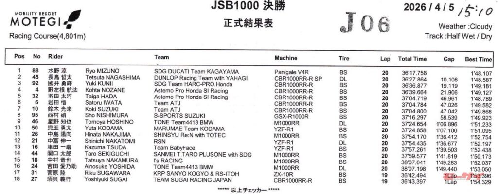 【2026年全日本ロードレースJSB1000開幕戦】昨年に続きドカティの水野選手が優勝。今季で引退表明の中須賀選手はクラッシュで苦しい幕開け。