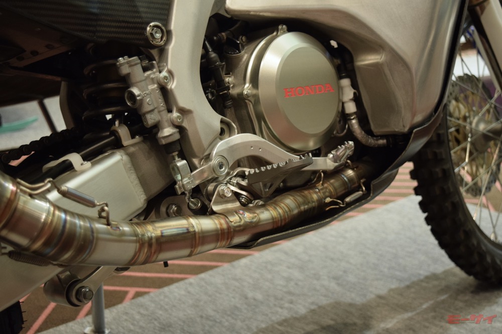 CRF450ラリーのエンジン下部。物々しいつくりのエキゾーストパイプが目立つ。アンダーガードはカーボン製