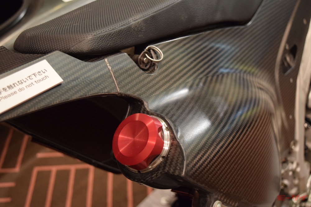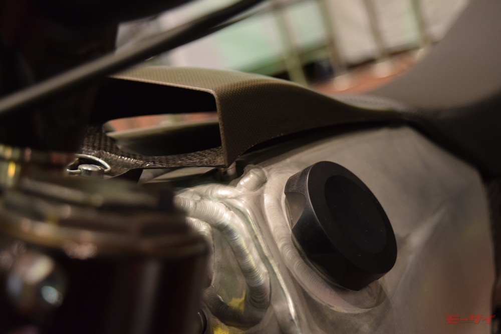 砂ぼこりを避けるためCRF450ラリーのエアインテークはタンク上にある。写真のカーボン製パーツはエアインテークの保護カバー