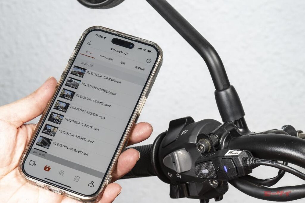 ハンドルに装着するコントロールスイッチのボタンを押す前20秒と後ろ20秒を含めた映像が、通常録画した映像データとは別に保存することができる「イベント録画」で残したい映像の消去を抑止。イベント録画中はボタンの赤LEDが点滅して止め忘れを防止する。この機能をツーリングで活用すれば、道のどまん中でも、ワインディングの途中でも、「ここぞ」というポイントの映像を残せるのだ。