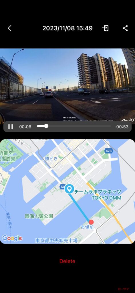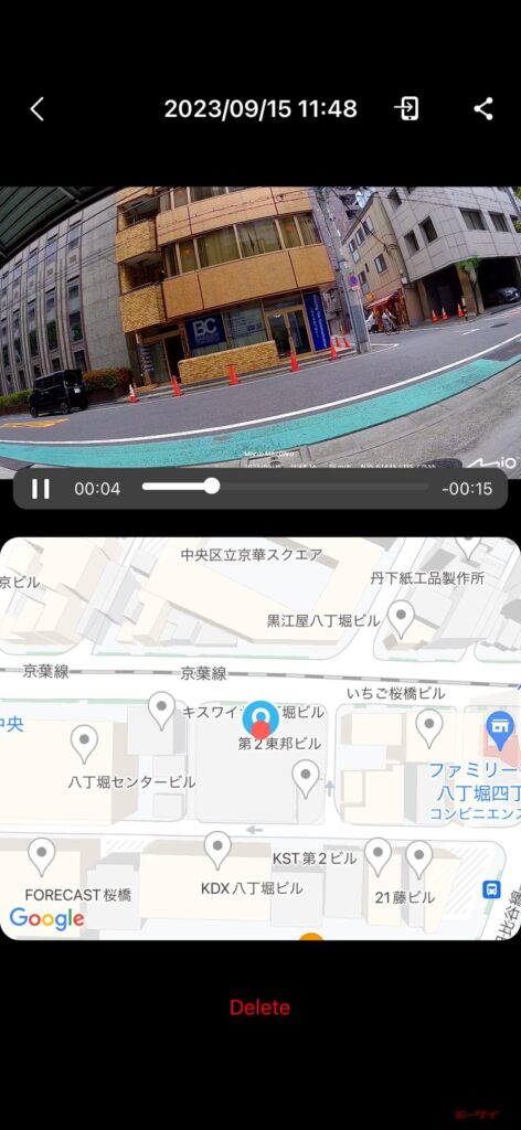 駐車中振動や光の変化などを感知すると自動で撮影を開始する駐車監視機能を採用。振動のみで作動する省電力モードなど3つのモードから選べて作動する感度なども細かく設定できる。こちらも自車位置がグーグルマップ上に表示される。