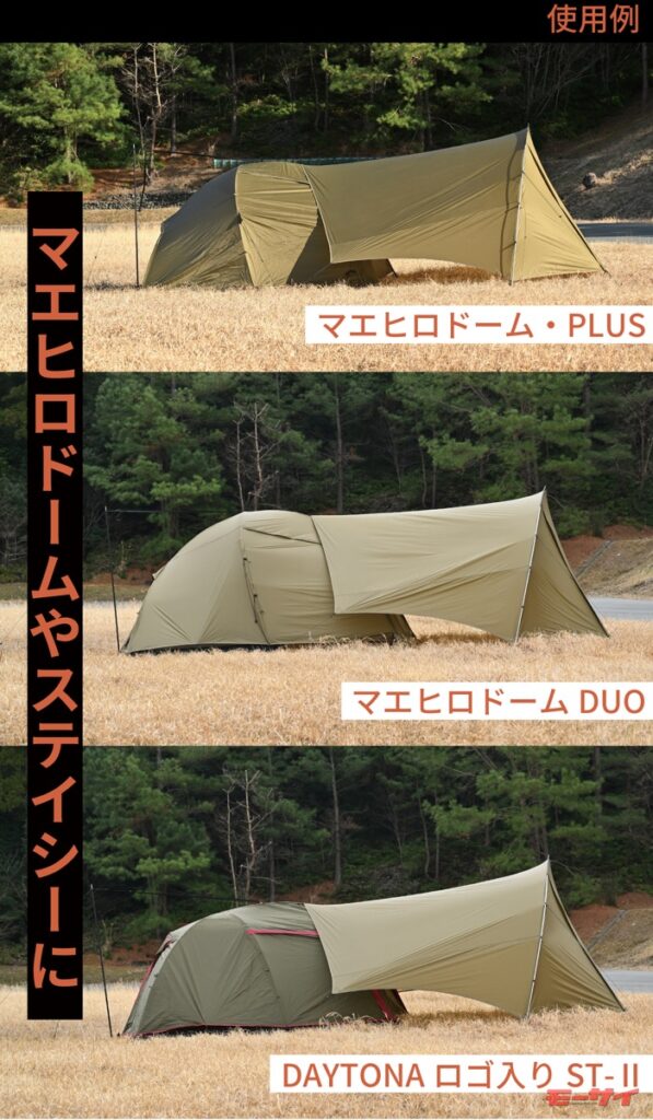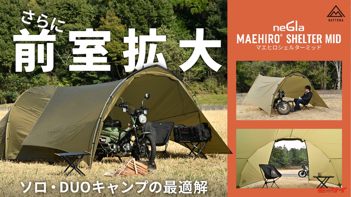 「前室にバイクを入れておきたい!」の最適解が【デイトナ】から!「MAEHIRO SHELTER MID」で快適キャンプ!