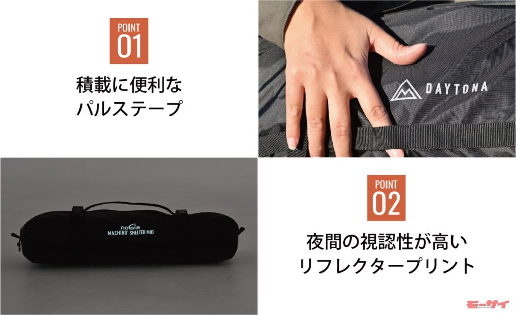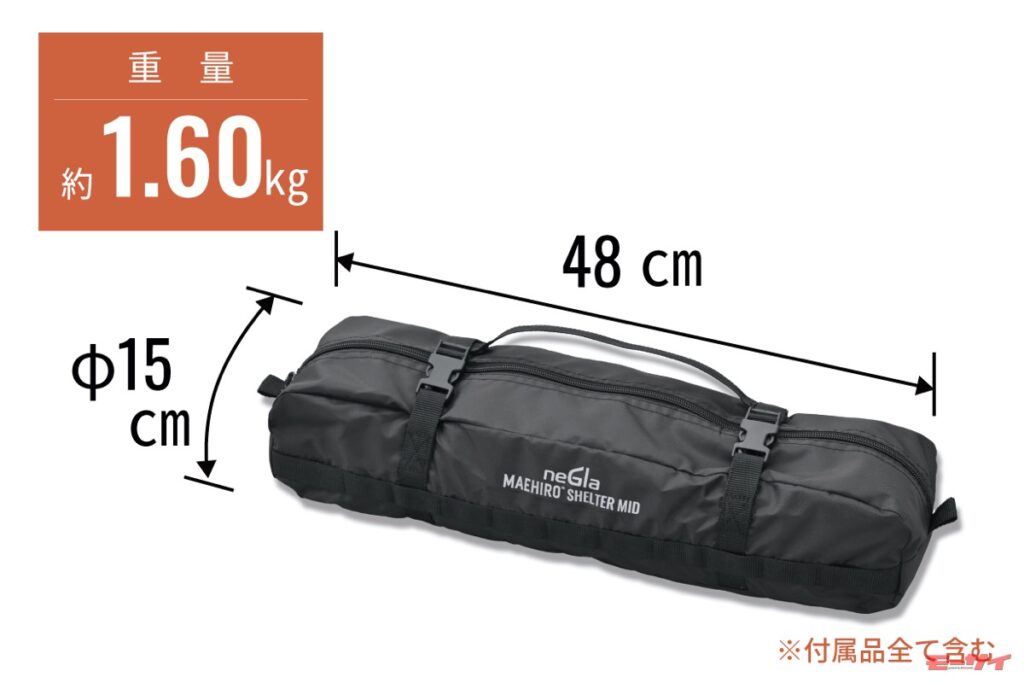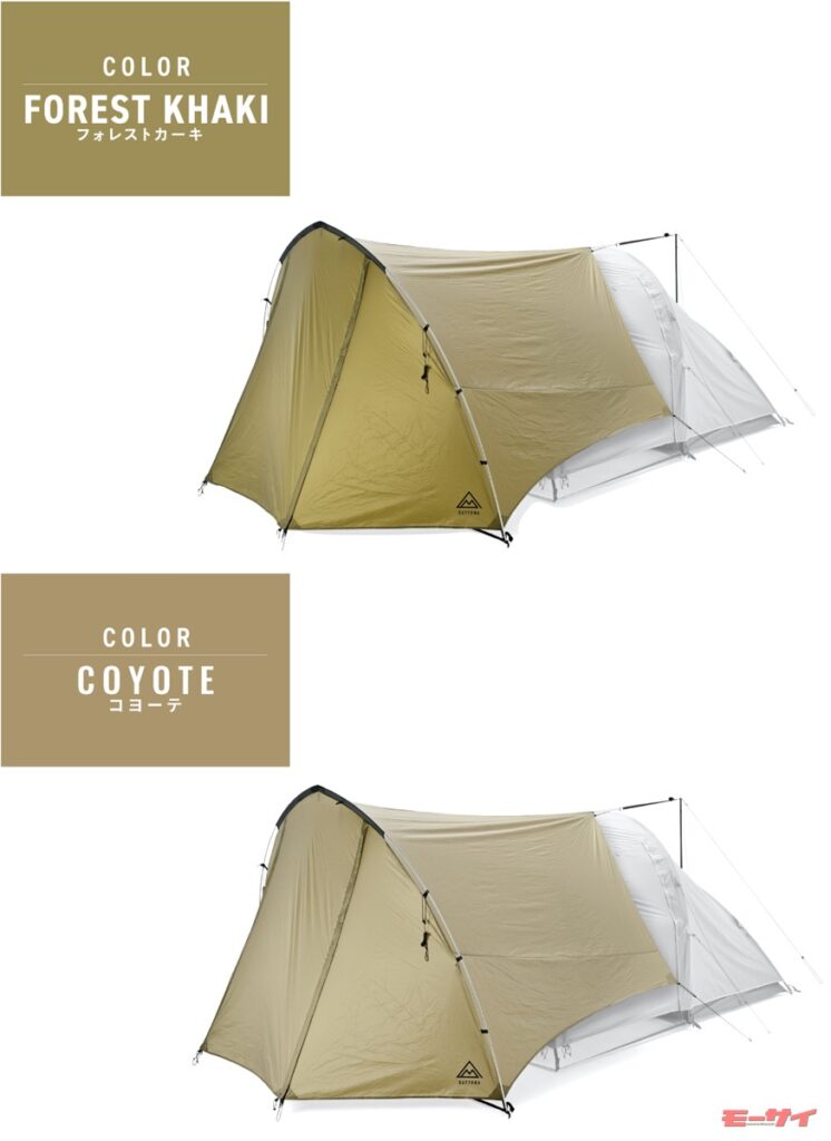 手持ちのテント(高さ95~150cm、幅220cmまでのテントに適合)にプラスするだけで、ファミリーテントのような広大なリビングスペースをつくることができる。カラーはフォレストカーキ、コヨーテの2色を設定。48cmの積載幅で重量1.6kg、収納袋はパルステープとリフレクタープリント付きと、バイクへの積載がよく考えられている。
