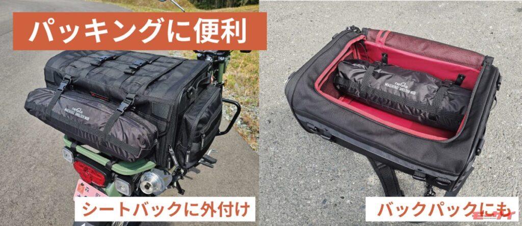 バイク旅でのテントとしては軽量コンパクトなものが選ばれがちだが、その手の製品では前室がなかったり狭かったりで不便なこともある。「MAEHIRO SHELTER MID」では、広い室内空間を利用して楽しいキャンプを体験できるようになっている。