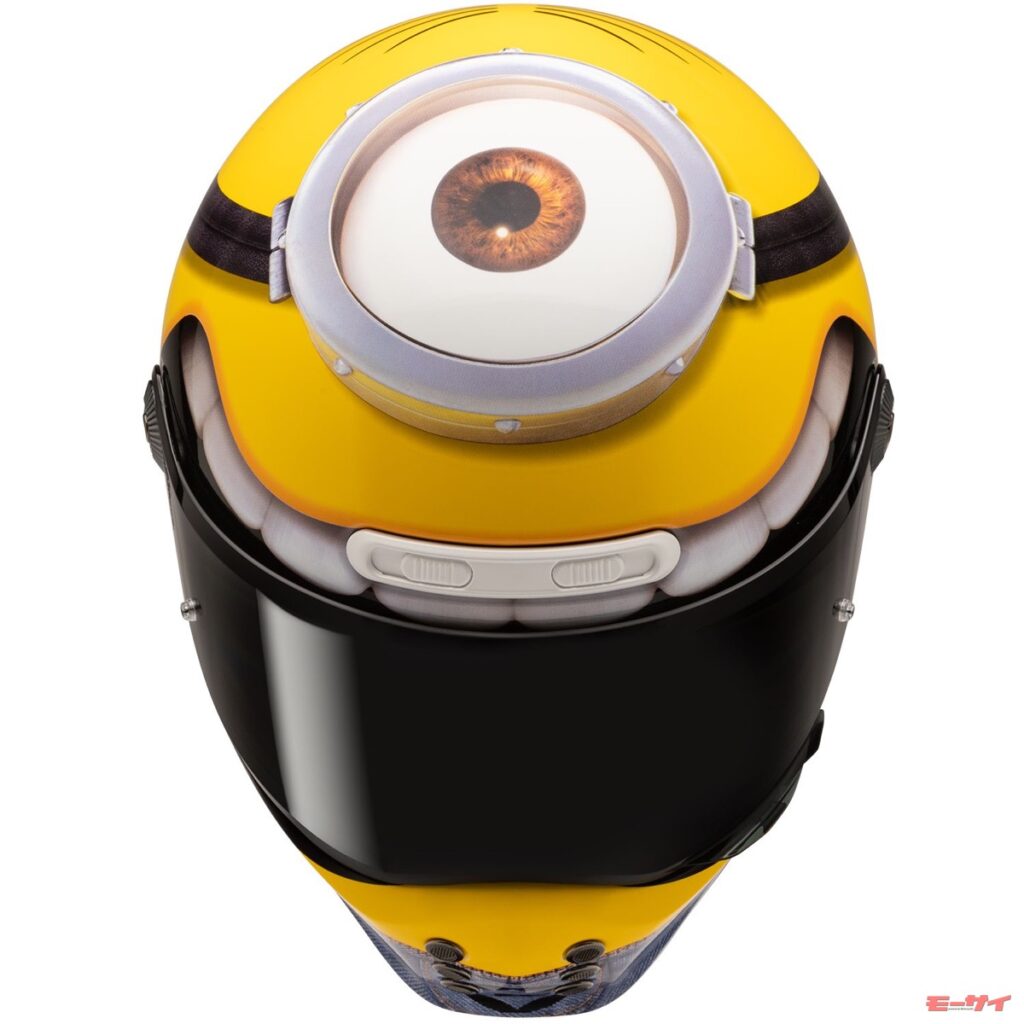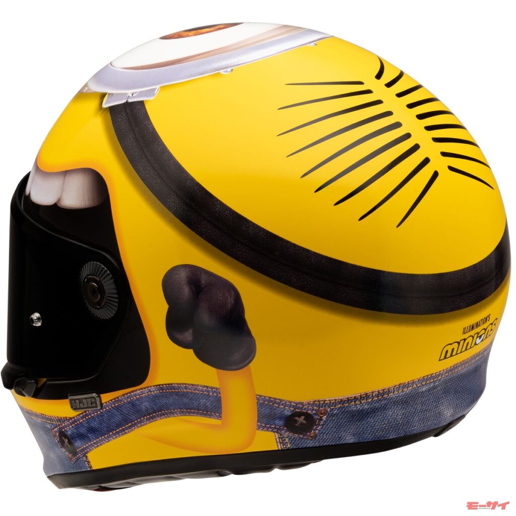 「MINIONS STUART」は、人気映画『怪盗グルー』シリーズ(配給元:ユニバーサル・ピクチャーズ)に登場するミニオンをモチーフにしたグラフィックモデル。「悪党に仕えること」が生きがいの、いたずら好きでどこか憎めない謎の生物、ミニオン。なかでも、クールかと思いきやひょうきんな面もあるユニークなミニオン“スチュアート”をHJCのクラシックモデル、V10に落とし込んでいる。