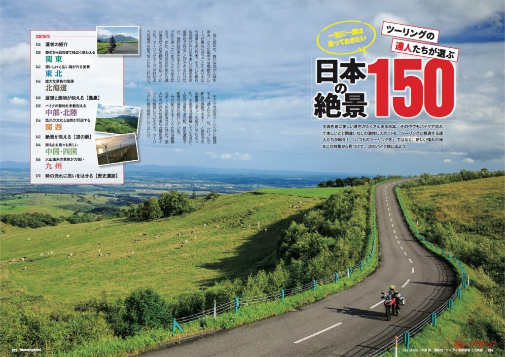 巻頭特集は「一生に一度は走っておきたい日本の絶景150」。ツーリングに精通した“達人”たちが厳選したハズレなしのスポットを盛りだくさんで紹介しています!