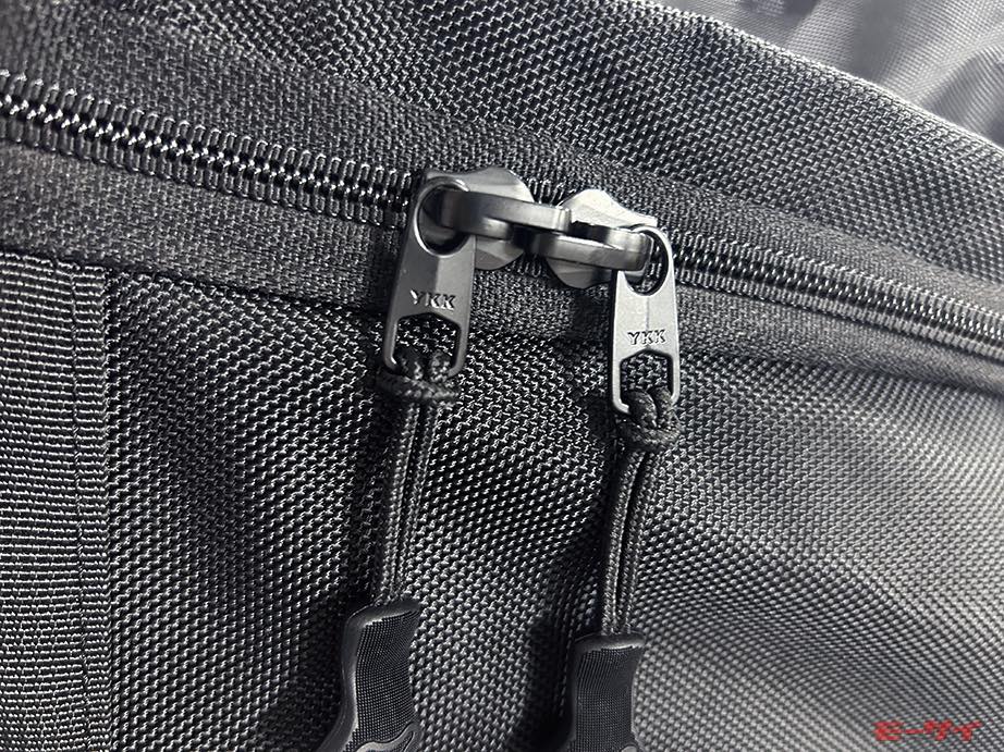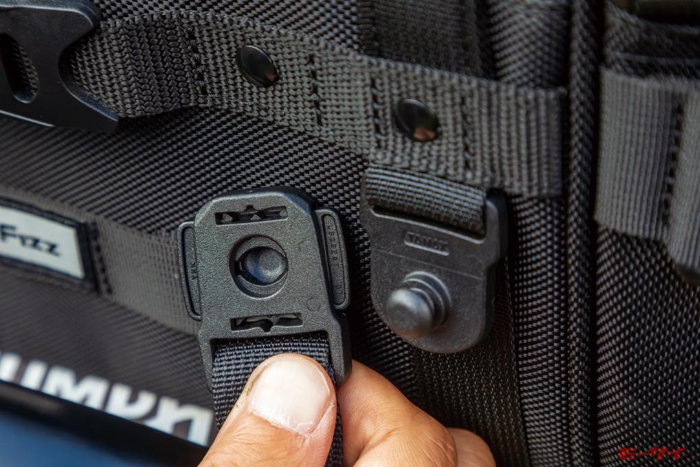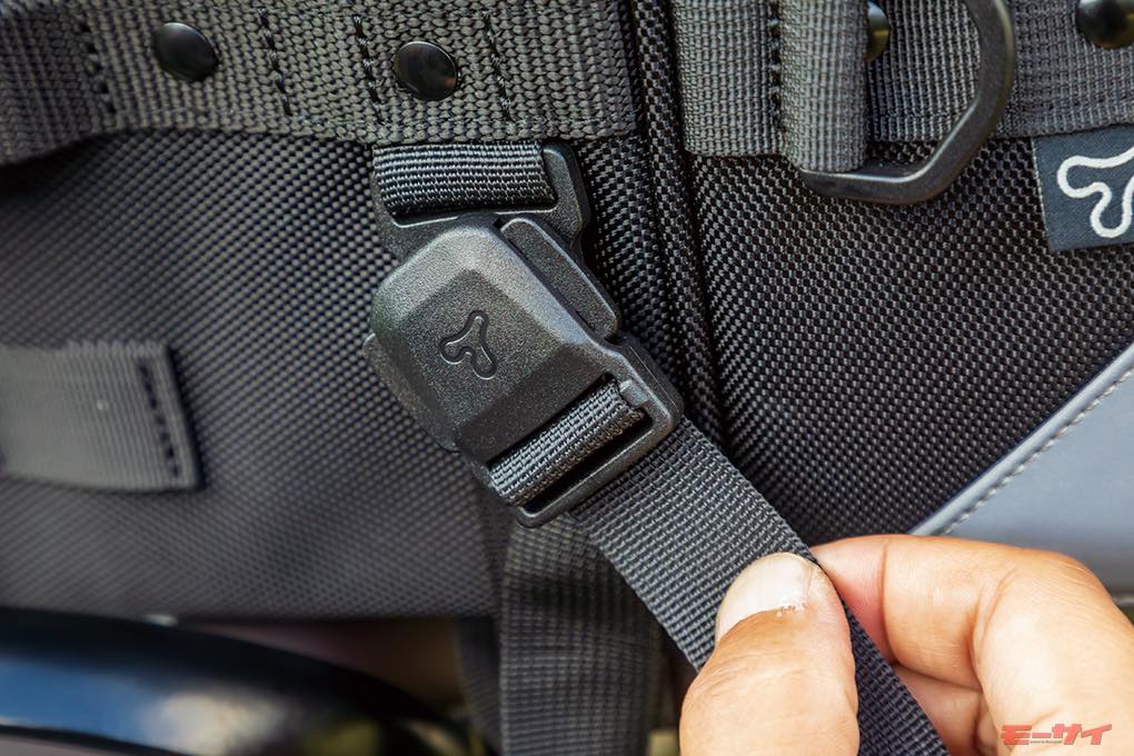 まず、大きく変わったのがバックルとファスナーだ。バイクとバッグを接続する部分のバックルはYKK製の「PF(ピボットフォージ)バックル」を新採用。このバックルは、ロックと解除が容易なのが特徴。バッグ側の凸部に、ベルト側の凹部をパチッとはめるだけで固定でき、解除はバックルの両端をつまむだけ。力はほとんど要らない。700ニュートンもの引っ張り強度を持っているので、しっかりと積載するために力いっぱいベルトを締めても壊れなさそうな感触だった。