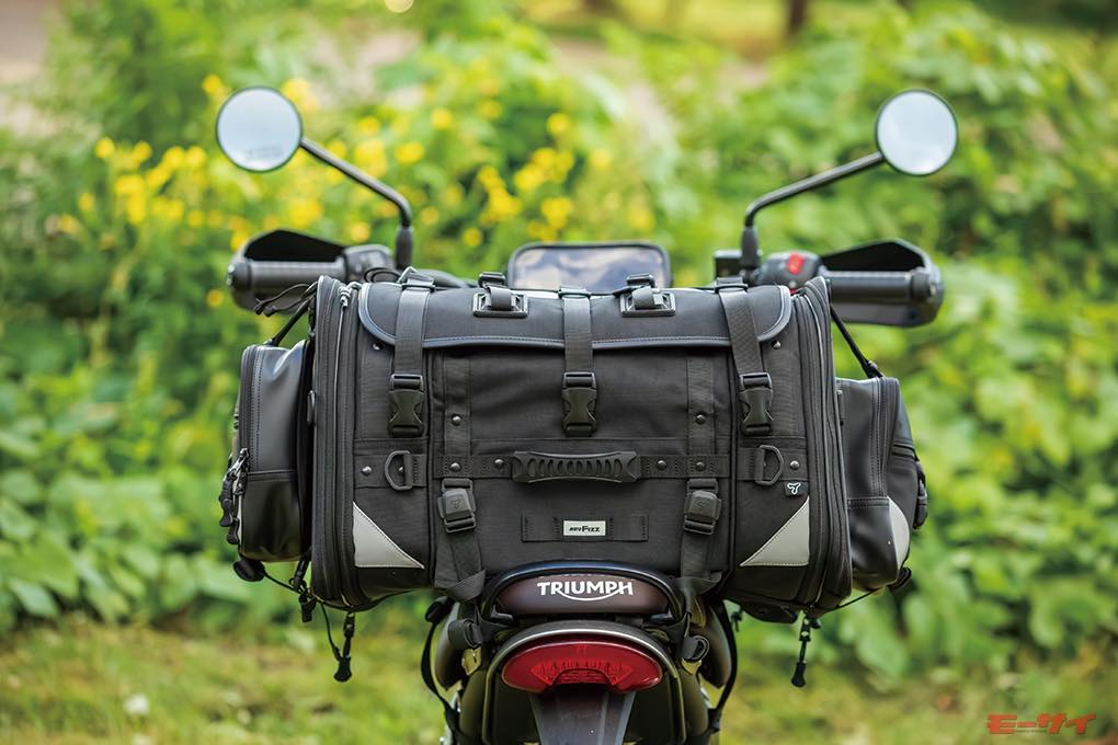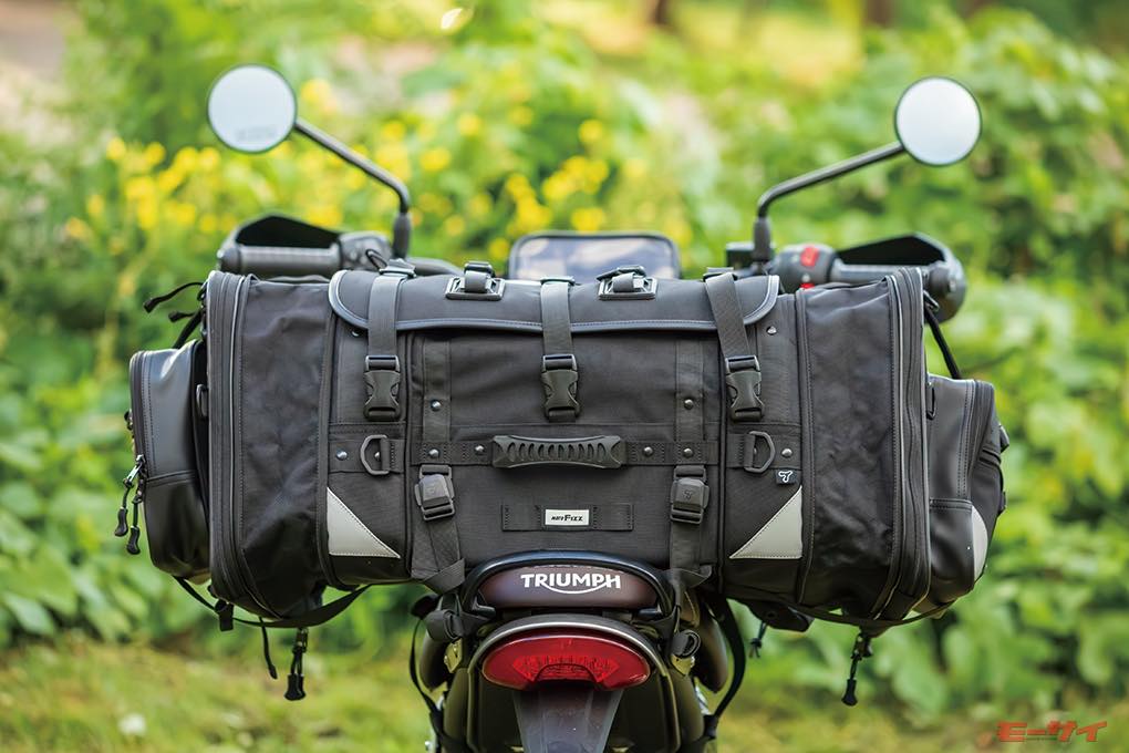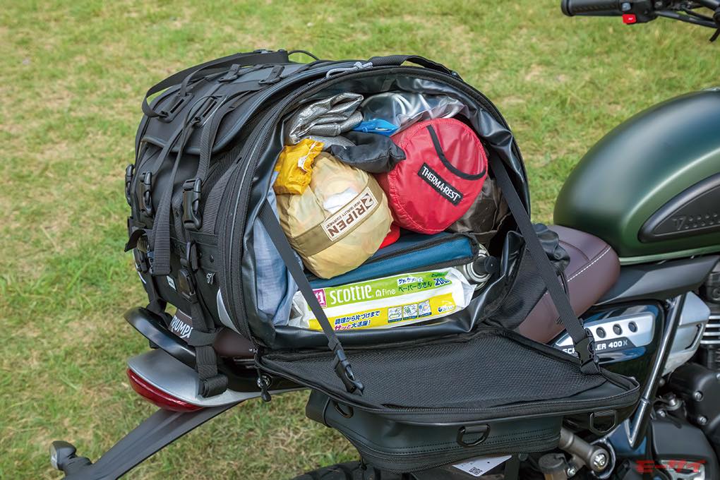 容量は、拡張しない状態でもキャンプ道具一式を飲み込んでしまうほど。さらに天面に積み上げた荷物を固定しやすいのもうれしい。全体の剛性感も高く、空荷でも形を保ってくれる。熟成の基本構造はそのままに、使い勝手と耐久性を高めた新型は、キャンプ好きライダーのニーズを完璧に押さえたバッグとなっていた。