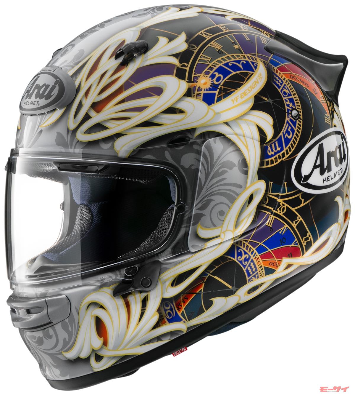 かわす性能でライダーを護り続けるアライヘルメットより、時計表示だけでなく、太陽や月の位置、星座、暦などを表示するチェコ・プラハの天文時計の名前を冠した個性的なフルフェイスモデルが登場。ベースは街乗りからロングツーリングまで、最新機能搭載で快適かつ安全な性能を確保したフルフェイスヘルメット「アストロGX」で、これに天文学的な機能美とゴシック調ラインを融合したグラフィックモデル「アストロGX・オルロイ」が新発売となる。