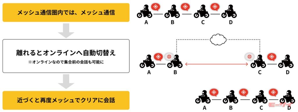 特筆したいのは、メッシュ通信がカバーする範囲を超えて通信が途切れてからのリカバリー通信手段が備わっていること。それが専用アプリによるプライベートチャンネルを利用した「オンライン通信」で、インターネット接続を介することで、距離の制約から解放されてずっとつなることができる。
