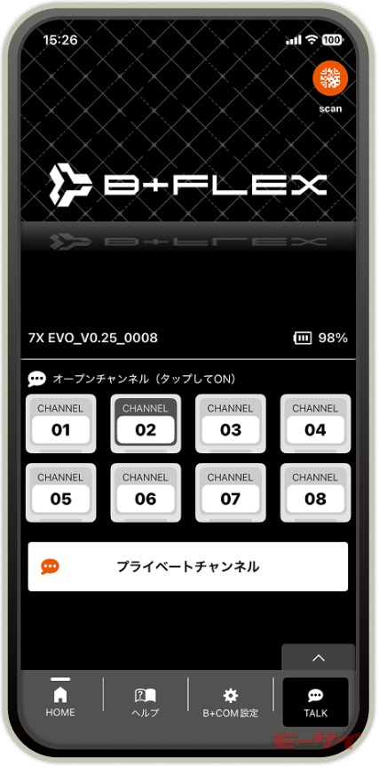 メッシュ通話は誰とでも通話できるオープンモードと、招待した人だけでグループ通話するプライベートモードの2種類。前者は電源ONから最短1秒で通話がスタートでき、煩わしいペアリングも不要となる。人数も無制限、チャンネルは8種。後者もアプリで簡単に設定を行うことができる。こちらも8チャンネル。
