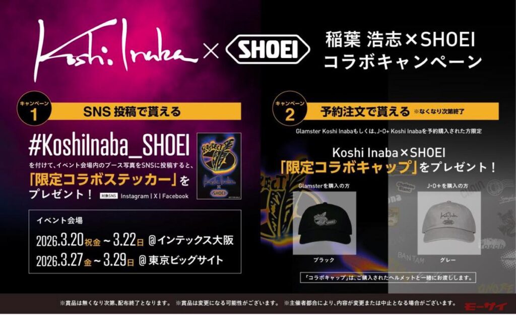 2026年3月20日(祝)~22日(日)にインテックス大阪で開催されている第42回大阪モーターサイクルショー2026の会場から、気になる情報を速攻レポート。SHOEIは、B’zのボーカリストとして知られる稲葉浩志監修の2モデルと、伝説的モーターサイクルコミック「キリン」とコラボレーションした3モデルを発表。誕生の背景を開発チームに聞いた!