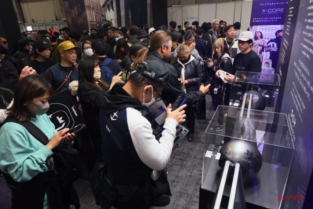 一方、今回のSHOEIブースでとんでもない数の来場者を集め続けたのが、「Glamster Koshi Inaba」と「J・O+ Koshi Inaba」から成る、稲葉浩志監修モデルだ。会場では、SNS投稿でもらえる「限定コラボステッカー」も配布。これも、身動きが取れないほどの群衆をつくる要因となった。コラボ誕生の背景を、企画・開発メンバーはこのように語る。