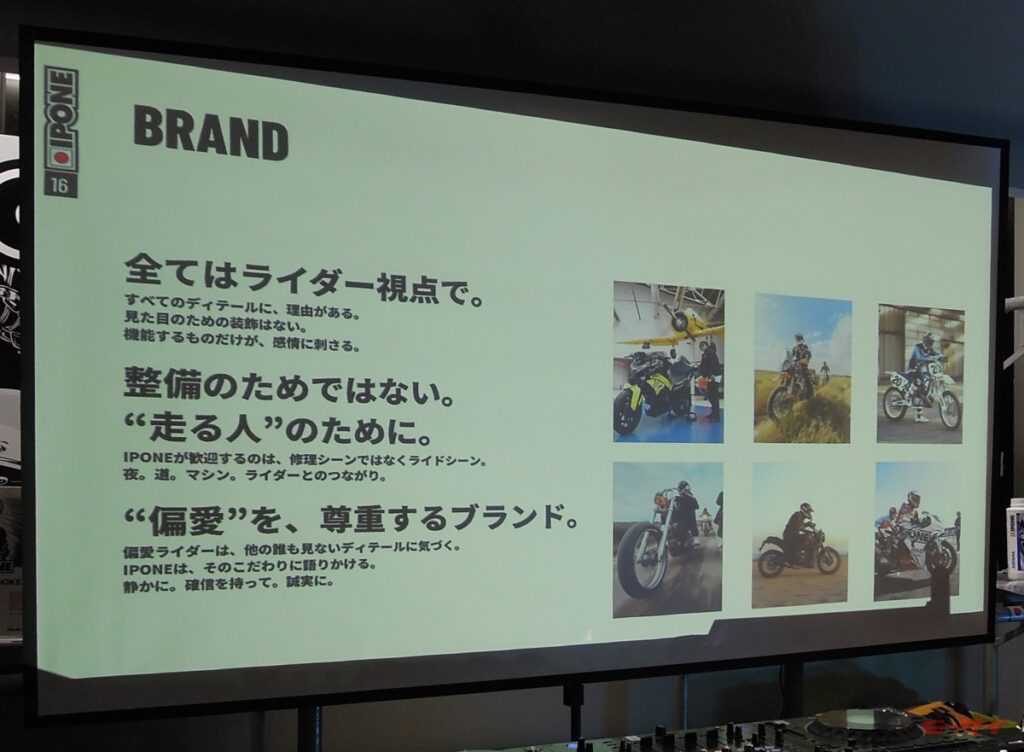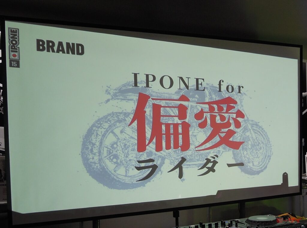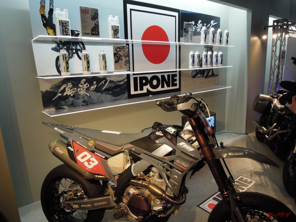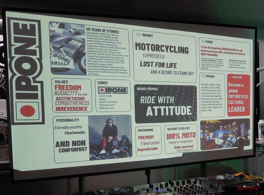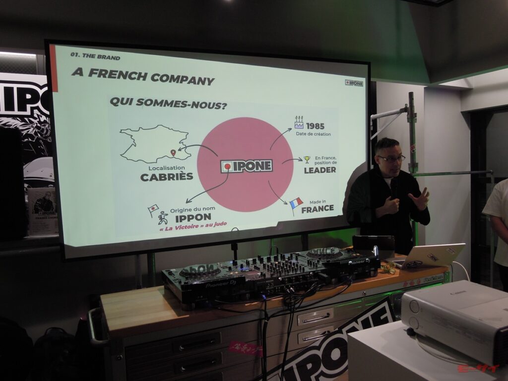 イポンは1985年にフランスのカブリエで設立された二輪車専業のオイルブランドで、エンジンオイルを幅広くラインアップ展開し、革新的なパッケージデザインと高い製品性能を融合させたブランドとして欧州を中心に多くのライダーから支持を得ている。ブランド名は、日本発祥の武道・スポーツで、フランスでも人気の柔道に由来しており、勝敗を決する「一本」という言葉が象徴する“強い意志”と“勝利”からインスピレーションを得たものだとされている。また、日本のバイクカルチャーやクラフトマンシップへのリスペクトも込められているという。