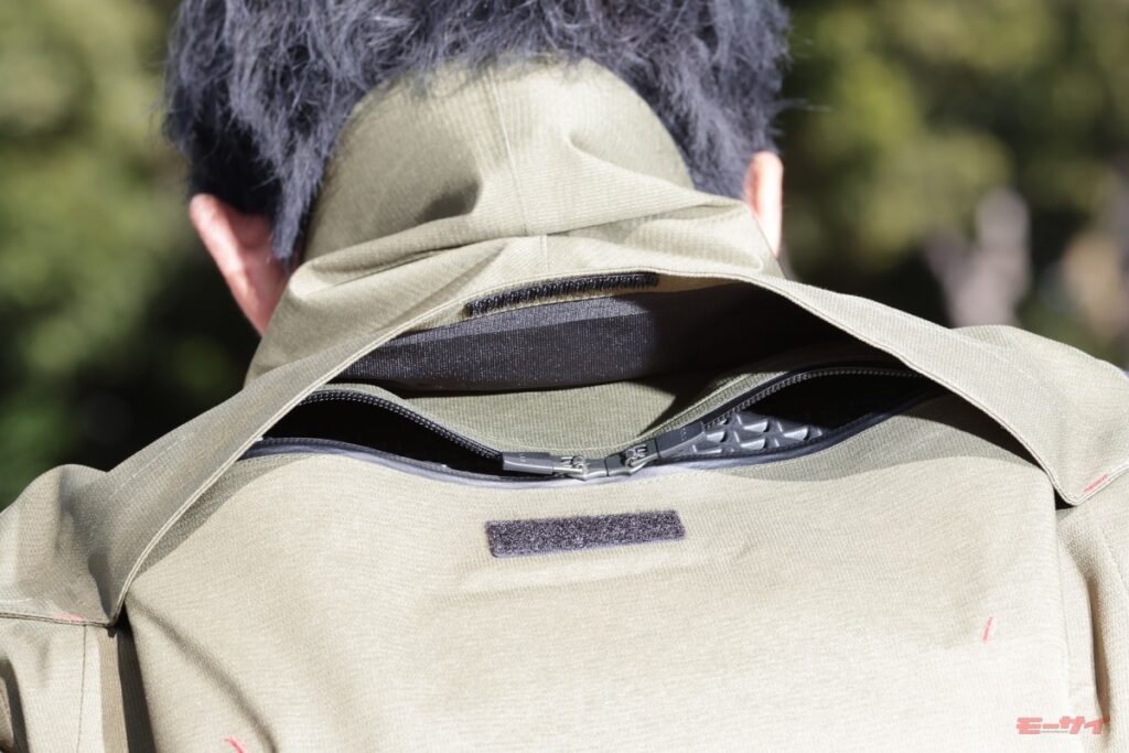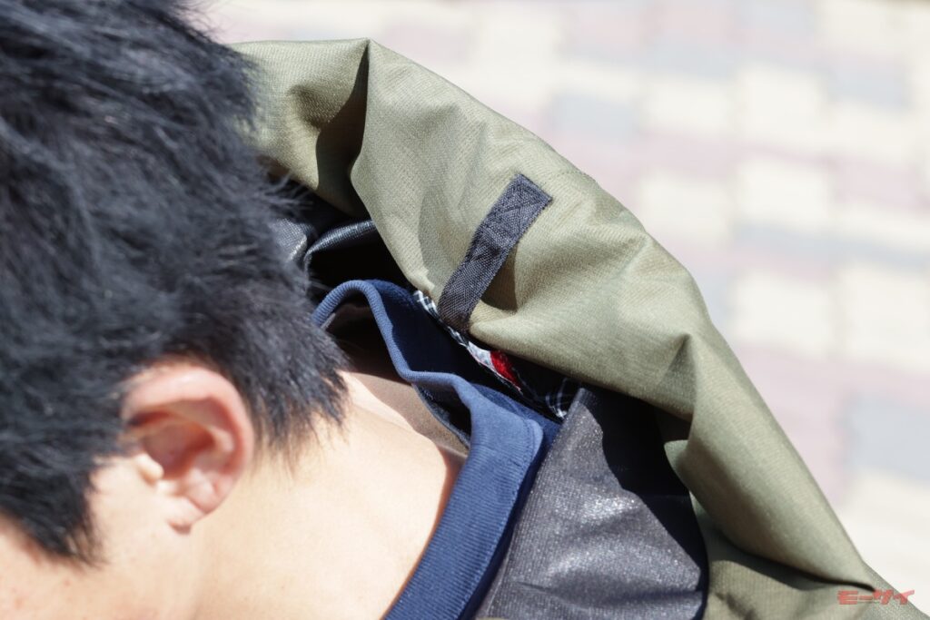 高速走行時などでは、バタつき防止タブを使って襟の内側のループにフードを固定したり、丸めてまとめることができる。