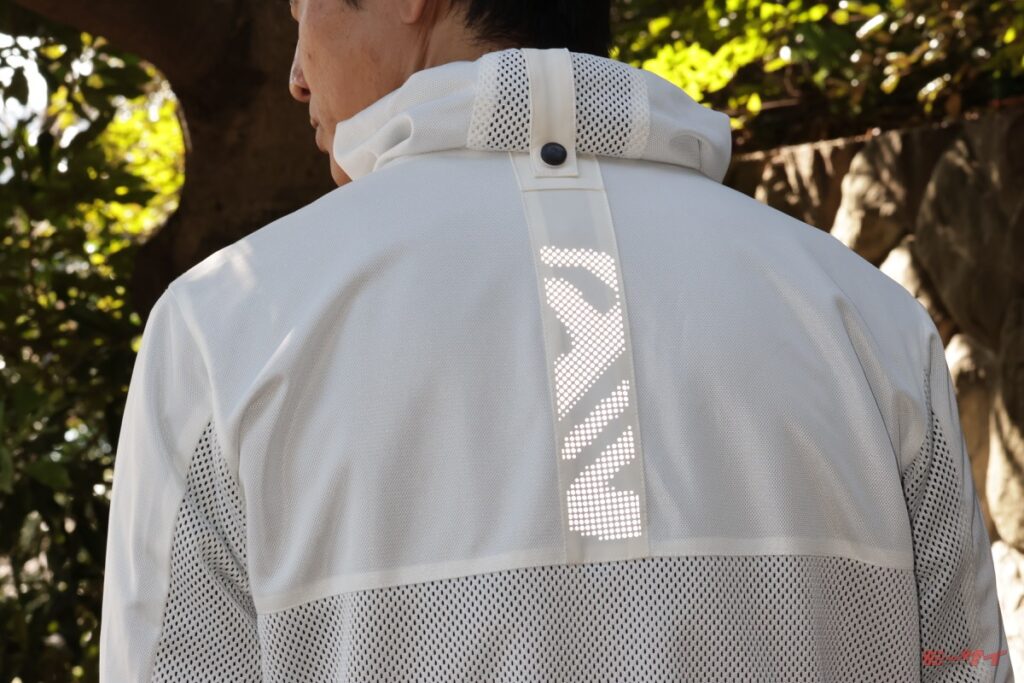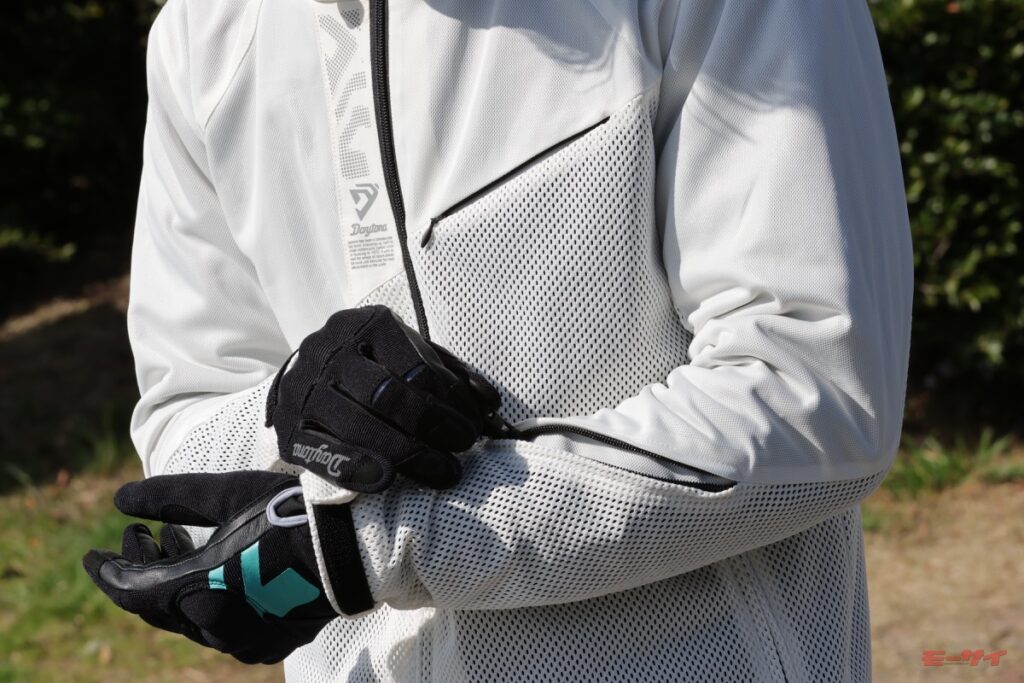 なお、ビッグホールメッシュは前腕部やフードの中央部分にも使われており、走行風が効率良く通り抜けるので走行中にバタつきにくい(フードはまとめて固定可能)。
