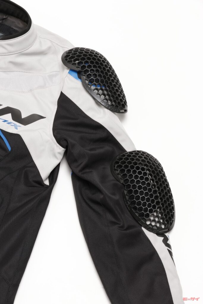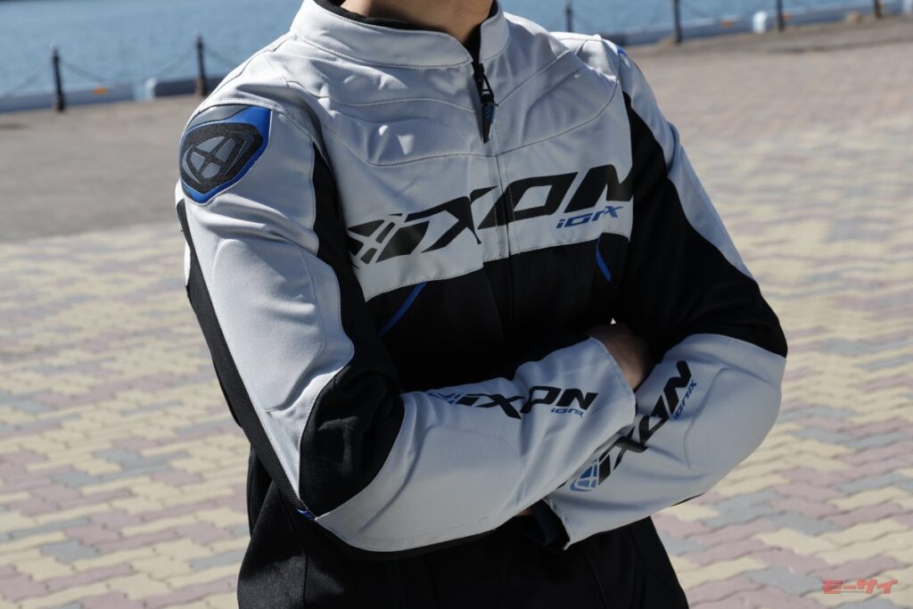 胸元や前腕のIXONのロゴ、肩のX状のマーク、切り替えカラーなどがスポーツ性を高めている。また、胸の上部や腹部、腕などの各所にパッドを装備しているのも特徴だ。防護性の向上とデザイン的なアクセントのための薄手のものだが、スポーティさにこだわるイクソンらしいアイデアと言える。