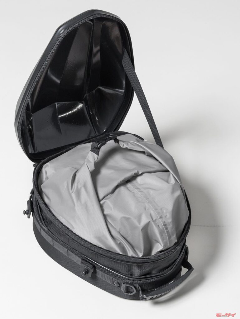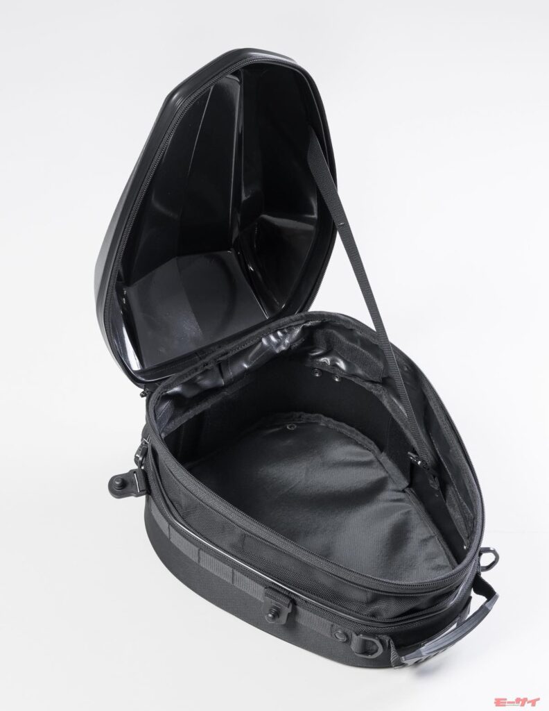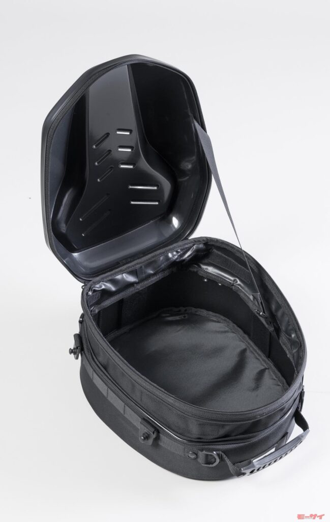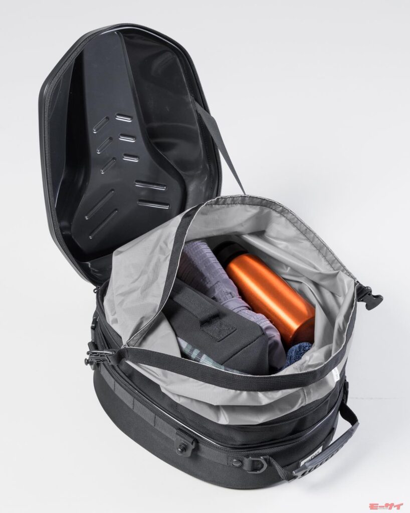 通常時14Lの容量は”M”の拡張時と同じため、レインウエアや工具などを収めても余裕がある。高さを拡張すれば18Lとなるので、お土産などを買って荷物が増えたときでも安心だ。天面のシェルは積載を考慮した形状で、別売りのツーリングネットなどを使った荷物の固定もしやすい。“M”同様、側面のPALSテープには市販のMOLLEシステム対応ポーチなどを取り付けられる。YKKの「WOVEN-IN タフジッパー」、開きすぎを防ぐストッパー、防水インナーも装備する。