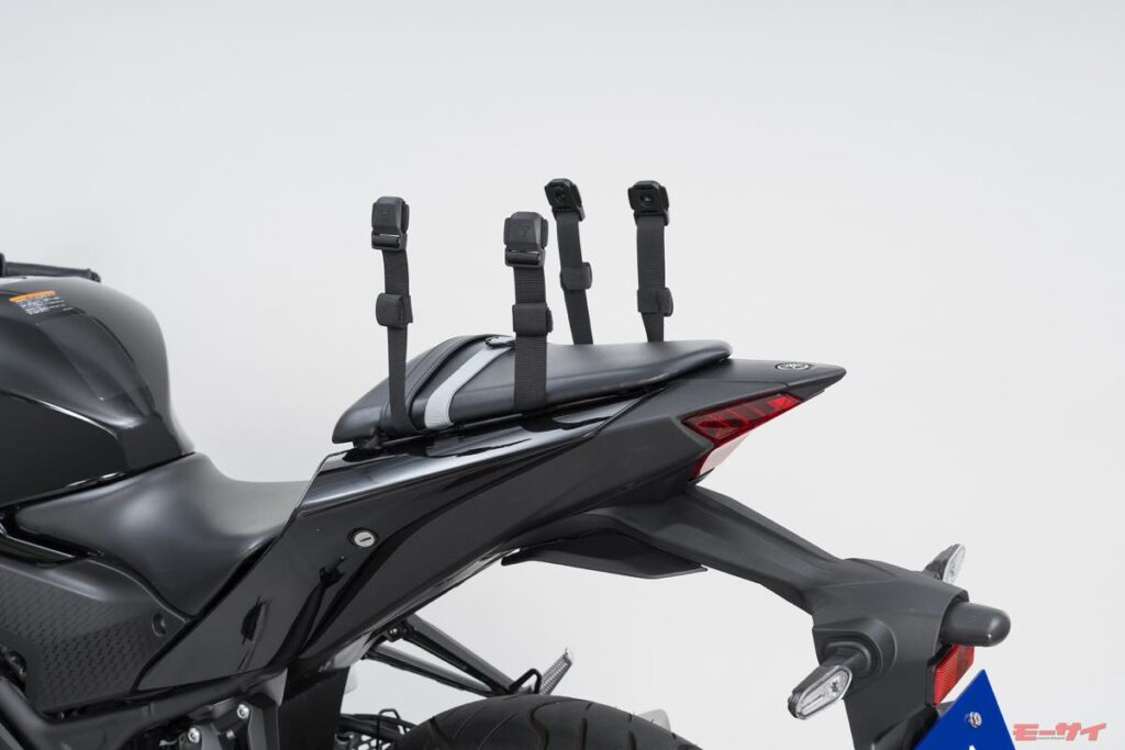 バッグの取り付けは、付属のKシステムベルトをタンデムシートに取り付け、バックルをつなげるだけと簡単だ。このバックルには回転するYKKのPF(ピボットフォージ)バックルを採用する。