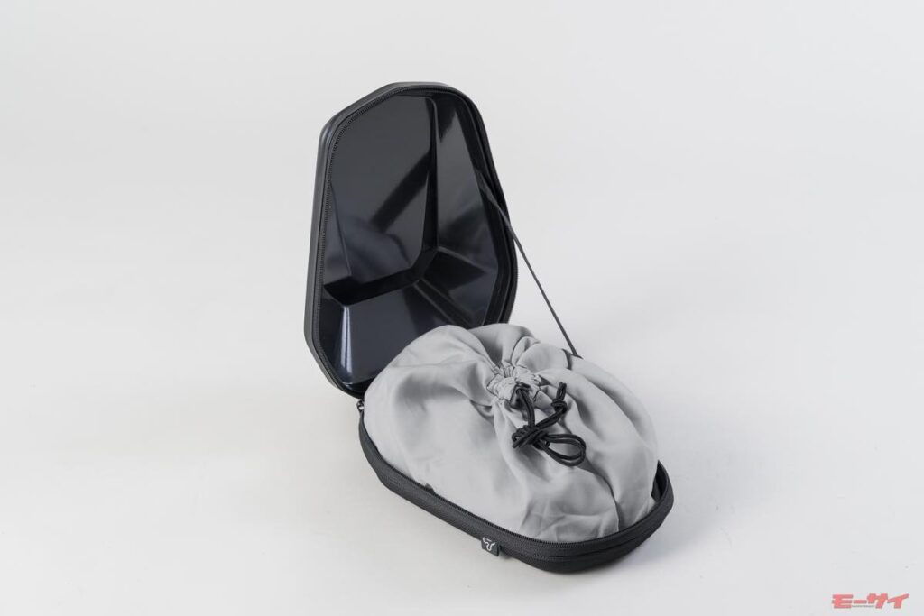 従来モデルのシェルシートバッグSSをリニューアルしたのが「シェルシートバッグS」。スマートフォンや財布、タオルやペットボトルのドリンクなど最小限の荷物を納めるのに適した、コンパクトなシートバッグだ。長さ(300mm)と幅(230mm)はスーパースポーツのタンデムシートとさほど変わらず、高さもわずか110mmしかないため、スポーティなシルエットを崩すことなく利便性を高められる。