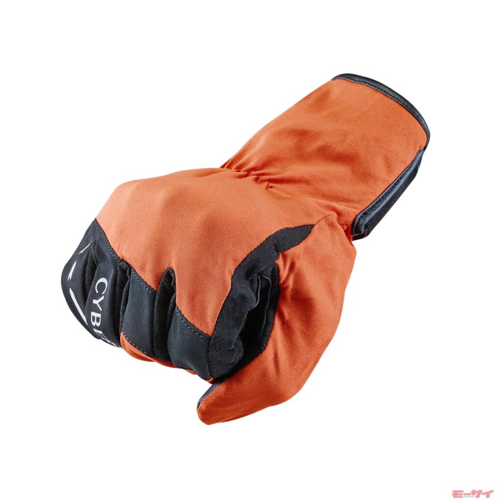 CYBERTEX グローブは、高耐水圧、高透湿性能を持つ同社のオリジナル素材 「CYBERTEX」を採用したロングカフ仕様のレイングローブ。その性能は、初期耐水圧2万mm/cm2、初期透湿度2万g/m2/24hとレインウエアに匹敵する。ストレッチ生地を用いて操作性をアップし、夜間の被視認性を高めるリフレクターロゴ&リフレクターパイピング、転倒時の安全性を確保するナックルプロテクターも備わる。