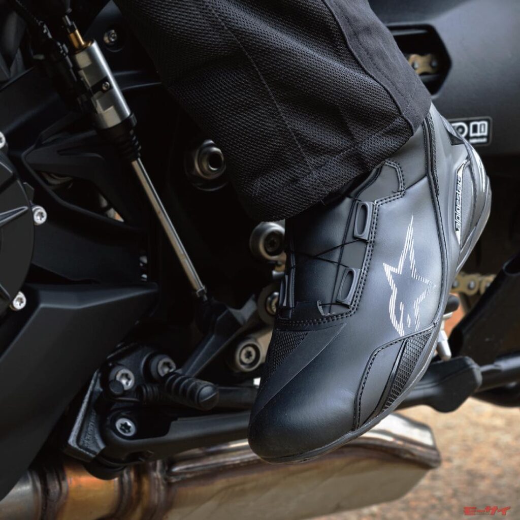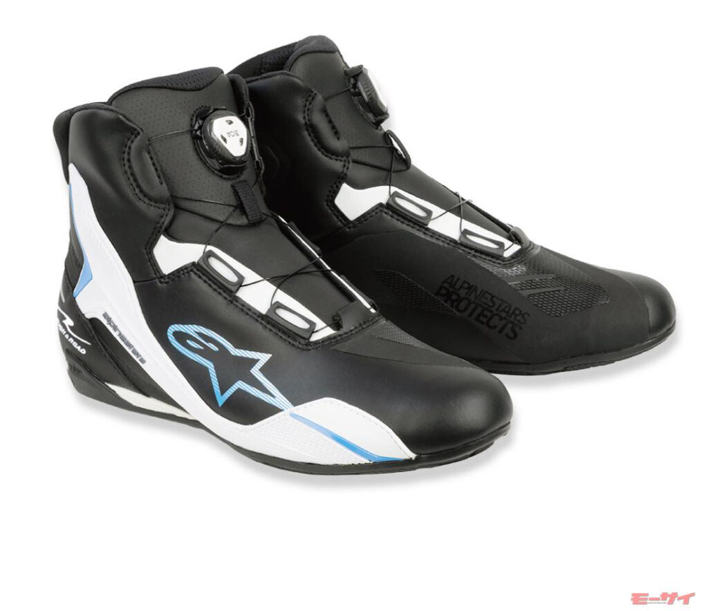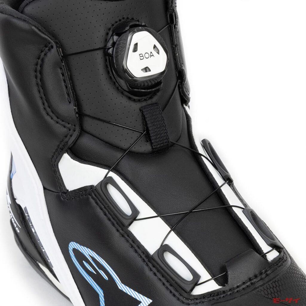 FASTER-4 BOAシューズ Asiaは、均一な締め付けと微調整が可能なBOA® Claw Jar Systemを採用。通気性があり、快適性も重視したハイパフォーマンスシューズだ。マイクロファイバーと熱溶着パネルの組合せで構成された無縫合構造アッパーは、通気性に優れた3Dメッシュや滑り止めマイクロスエードなどを適材適所に配置するなど、Alpinestarsが培った経験に基づいた本格設計を採用している。
