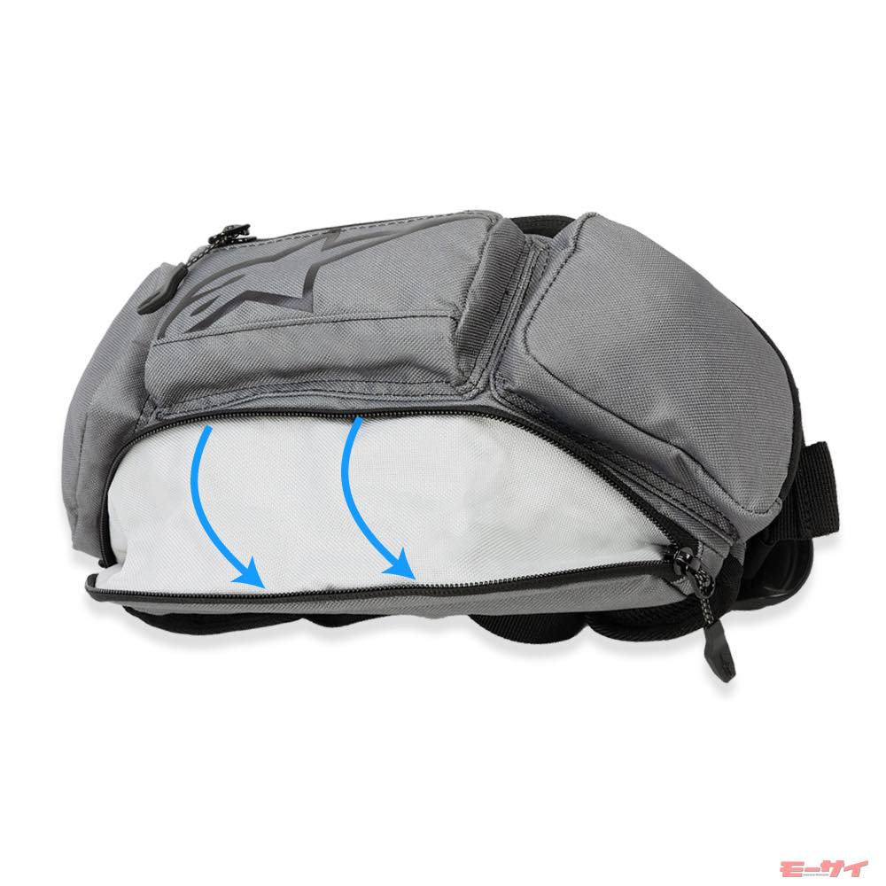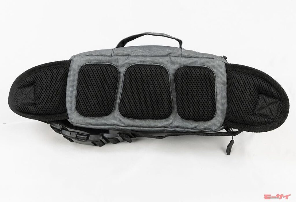 カンガ2 ウエストバッグは、容量2.5リットルながらスリムでライディングを妨げない、フィット感の高いウエストバッグ。細分化されたポケットによって収納力は高く、防水仕様ではないが表面は撥水コーティング加工が施されている。バッグ底面のファスナーで容量アップが可能な設計だ。