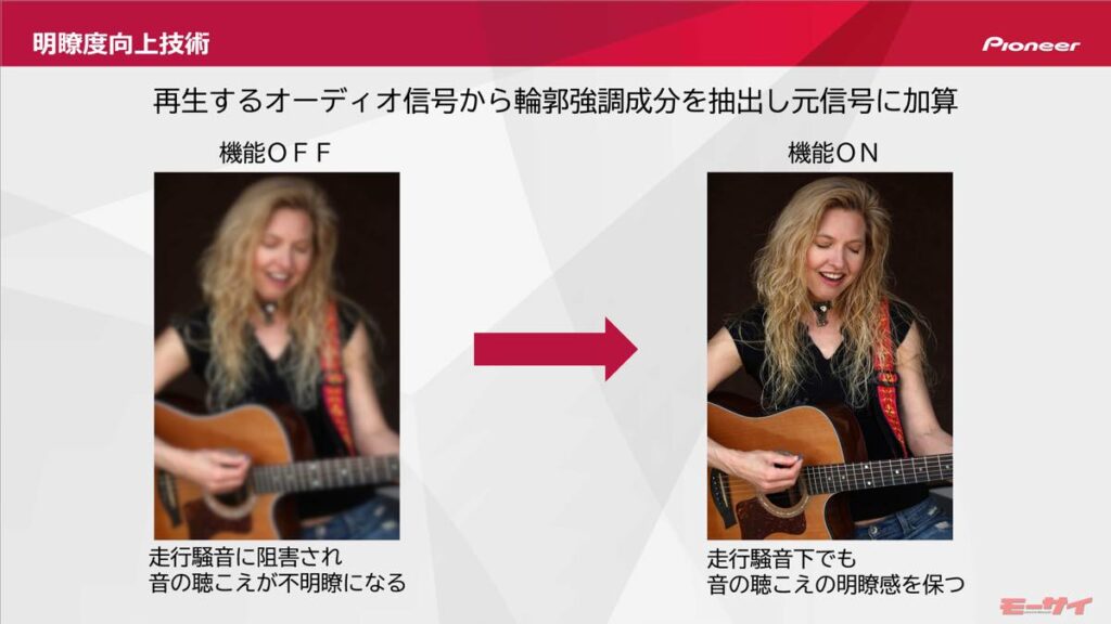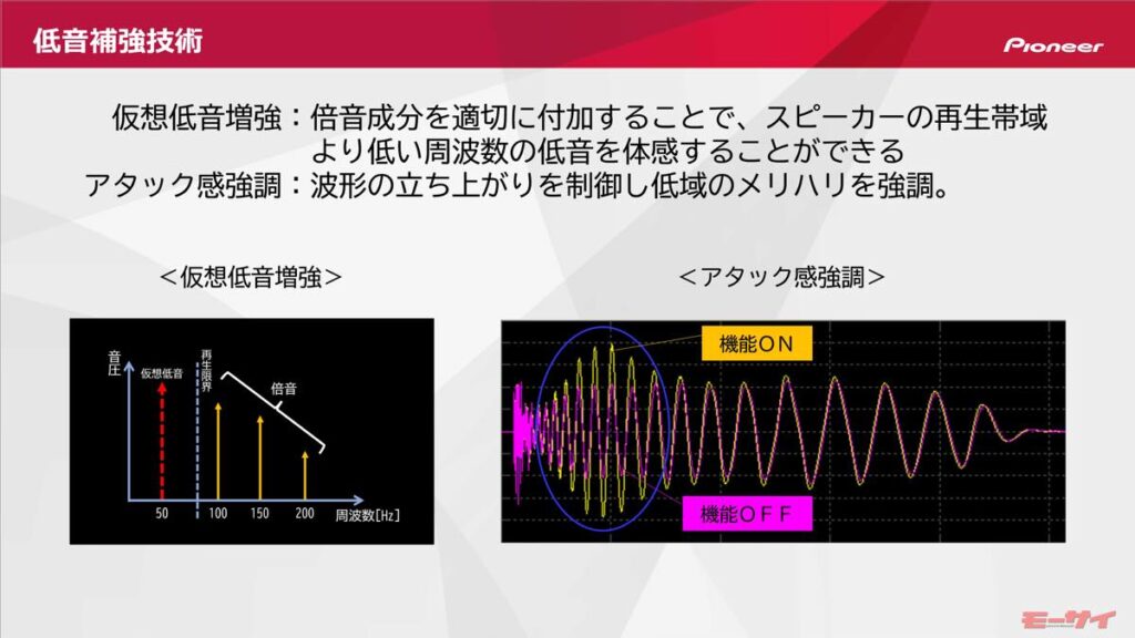 これまでも B+COMのスピーカーは高音質と評価されていたが、走行中の高音質を求め、風切り音や走行時に発生するノイズ対策に、さらなるレベルアップを目指したという。そこでハードウェアだけでなくソフトウェアの改良を求め、カーオーディオメーカーのパイオニアと協業。同社が持つ「音響デバイス特性補正技術」、「サウンド明瞭度向上技術」、「低音補強技術」の3つの信号処理により走行ノイズにかき消されがちな低音域を豊かに再現することで、走行中でも快適でかつてない臨場感溢れるサウンド体験を実現した。