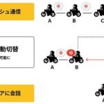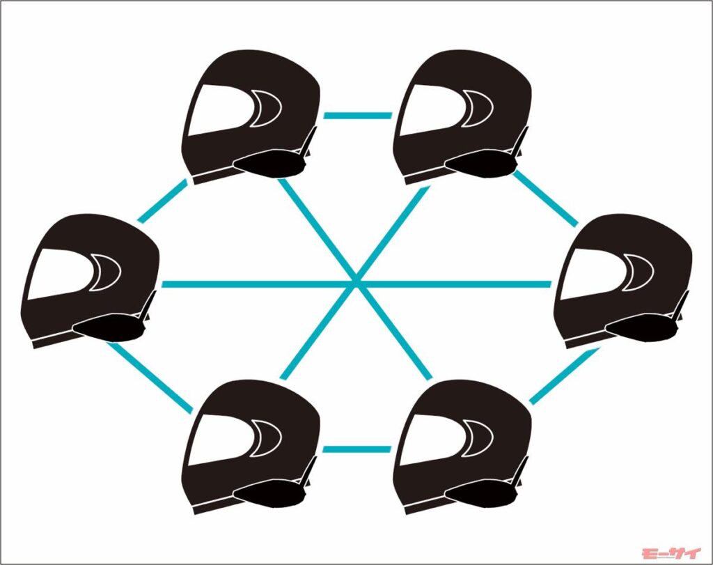 従来のブルートゥースの1対1通信の数珠つなぎと違い、メッシュ通信は多数対多数で網目のようにつながるため、隊列の順番やメンバーの出入りなどを気にする必要がないのが特徴。また、たとえ通信圏外へ離れてしまっても、再び近づくだけで瞬時に、そして自動的に会話へ復帰できる。事前の複雑な設定は必要ない。