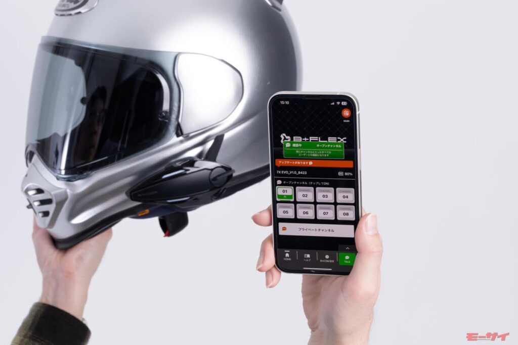 B+COM 7X EVOは、メッシュ通信とオンライン通信の2つの通信方式を採用した新開発の通信方式「B+FLEX」を搭載。B+COM 7X EVOではこの2つの通信方式を自動で最適な方式に切替えるハイブリッド型で、走行中に切替えを意識せずシームレスな通話が可能。