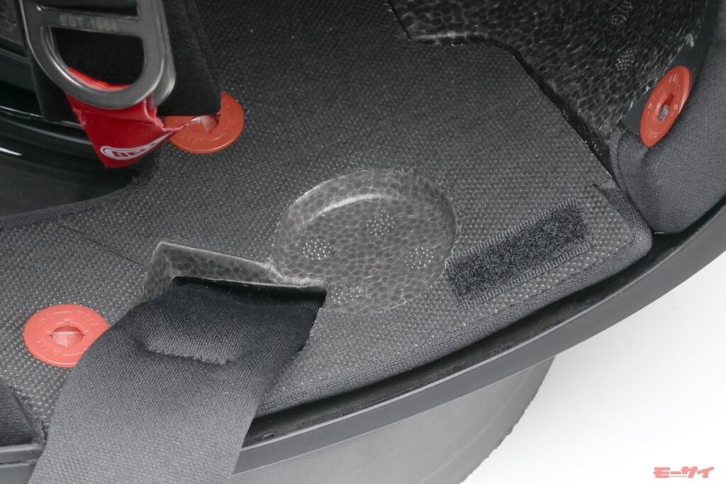 ドロップダウンインナーシールドは帽体側面のスライドスイッチでスムーズに上げ下げでき、シーンに応じて素早く視界を調整できる。ライナーにはインカム用スピーカーを収納するスペースも装備する。