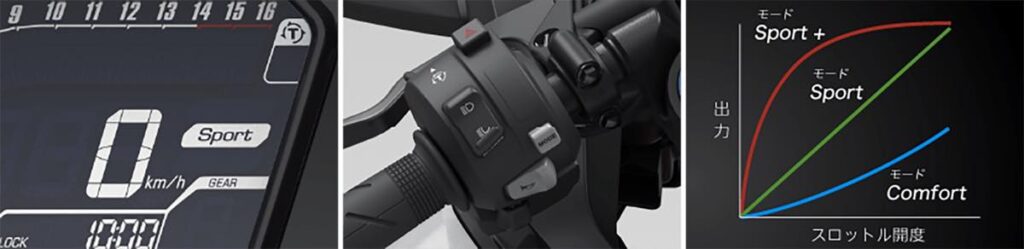 そして、CBRのもうひとつの特徴は、3つのパワーモードを搭載していること。穏やかな「コンフォート」、標準の「スポーツ」、パワー感全開の「スポーツ+」の3段階で、コンフォートは雨天でも開けやすいだろうが、個人的にはパワーを詰まらせている印象に思えた。素直な回転の滑らかさと鋭い刺激のバランスがいいのは中間の「スポーツ」で、一番パワフルな「スポーツ+」は、明らかに回転上昇とパワーの出方が元気なものの、常に必要ではないという印象。ただし、明確に差が実感できるので、状況に応じて有効に使えるだろう。