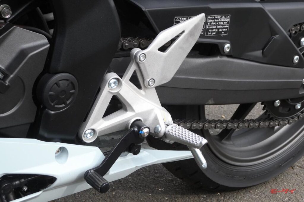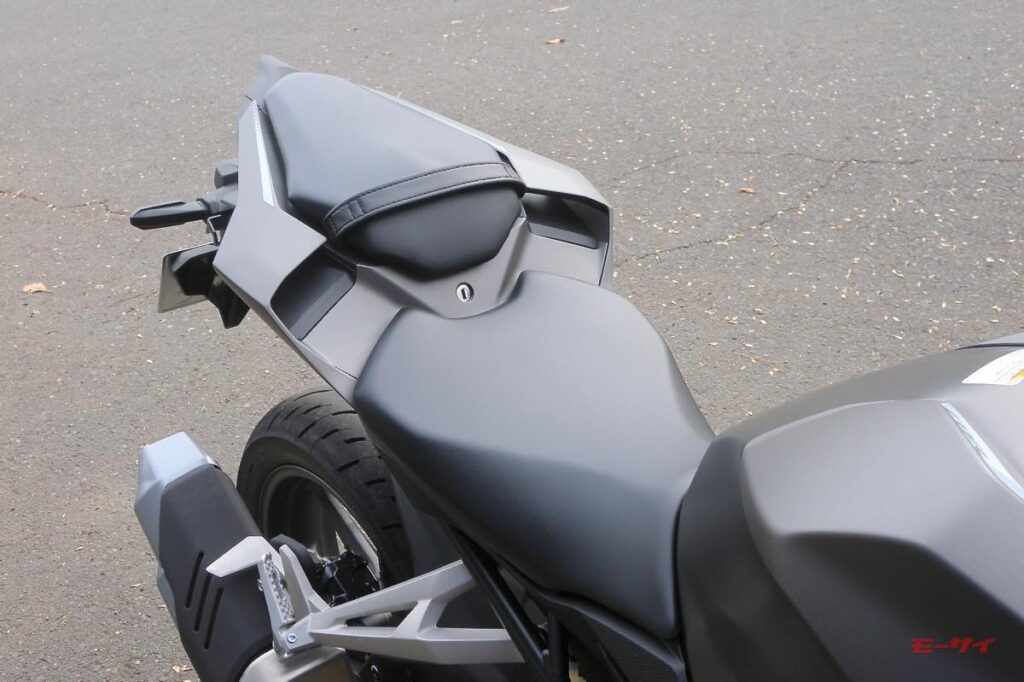 借用したCBRは、落ち着いた雰囲気のマットビュレットシルバー。オジサンがまたがっても引け目を感じないシックな色合いがうれしい。しかし、ライディングポジションの第一印象は「けっこうレーシーな前傾姿勢&バックステップ」というもの。先日試乗したスズキの2台よりも、セパレートハンドルは遠くはないものの低く、足をステップに置けばヒザの曲がり具合も相応にタイト。この印象は乗り続けるにつれ薄れるのだが、一方で足着き性は良好。身長173cmの体格で、両足カカトまでべったりと接地する。スリムな車体の恩恵で、足が素直に下ろしやすいのも利点だ。