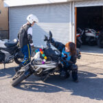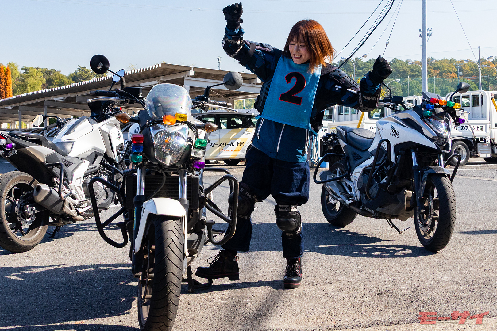 しかし、ここで頼れるのがファインモータースクールのサポーターさん(指導員)。足の位置、体重をかける方向、腕に力を入れないコツなどを、ゆっくり丁寧に教えてくれます。何度も試していくうちに、少しずつできそうな瞬間があり、その後、今まで感じたことのない軽い感触が足元に伝わりました。そして、ふわりと車体が持ち上がり、センタースタンドがかかりました。人生初の成功。その達成感たるや、ひとしおです。