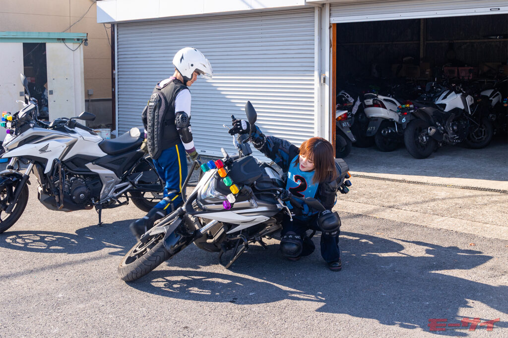 そして最初に挑むのが、教習の登竜門・引き起こし。これができないと先へ進めないので、自然と気持ちも引き締まります。