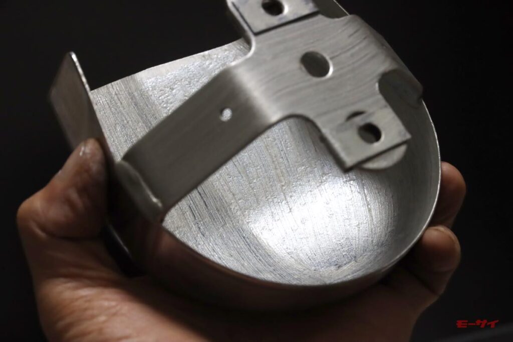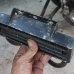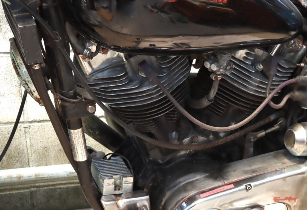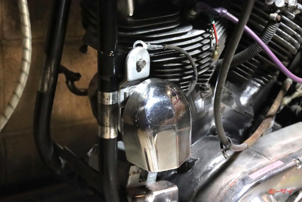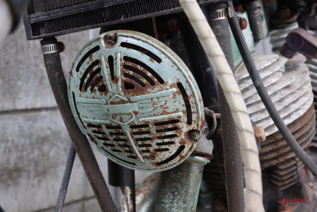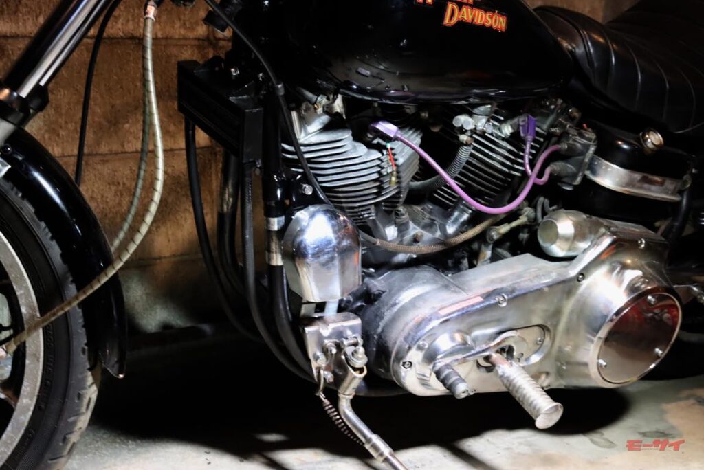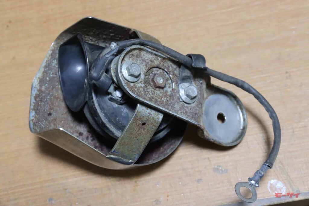 当初付いていたホーンもクラシカルな雰囲気は良かったのですが、緑青がすごくて、それを落とすのに苦心しました。その時点ではまあまあ再生できたものの、「元の取付け位置が、シリンダーヘッドに当たる走行風の妨げになるかも?」と、気になり始めました。そこで、オイルクーラーの下に付いていたこのホーンを外し、自分がローライダーに抱いていたイメージ=カウベル型のホーンがエンジン横に付くタイプにしてみようかと、考えたのです。
