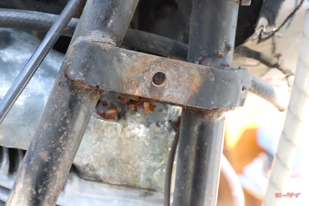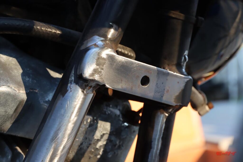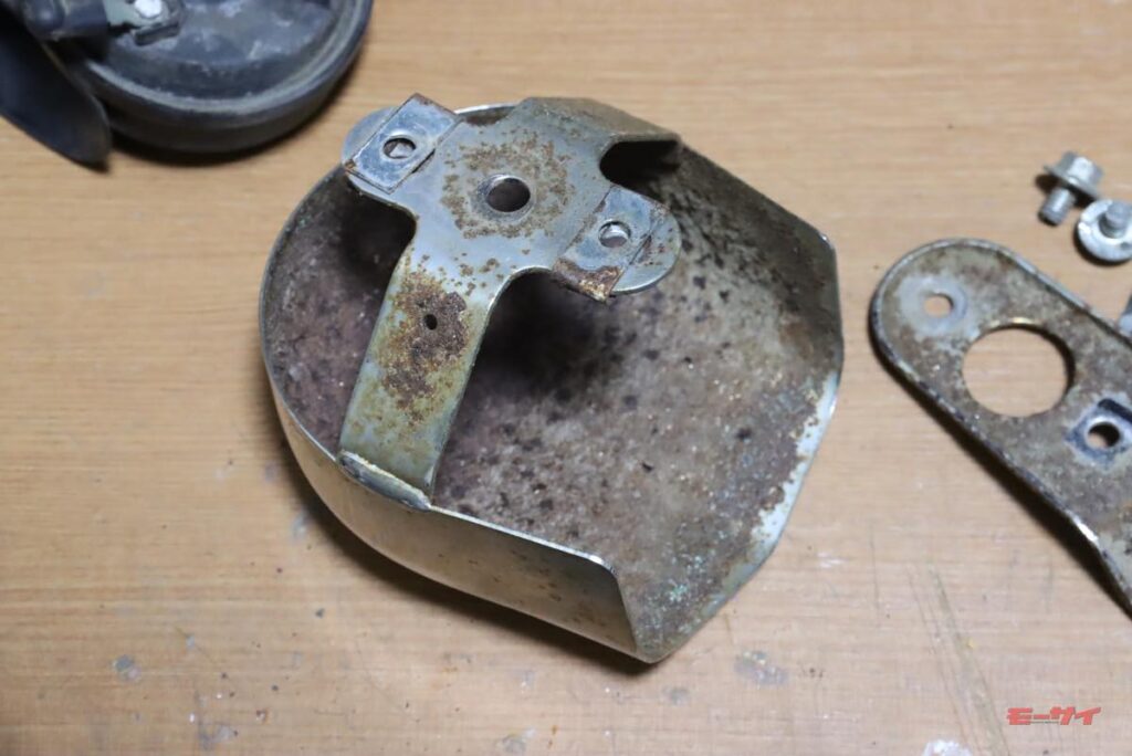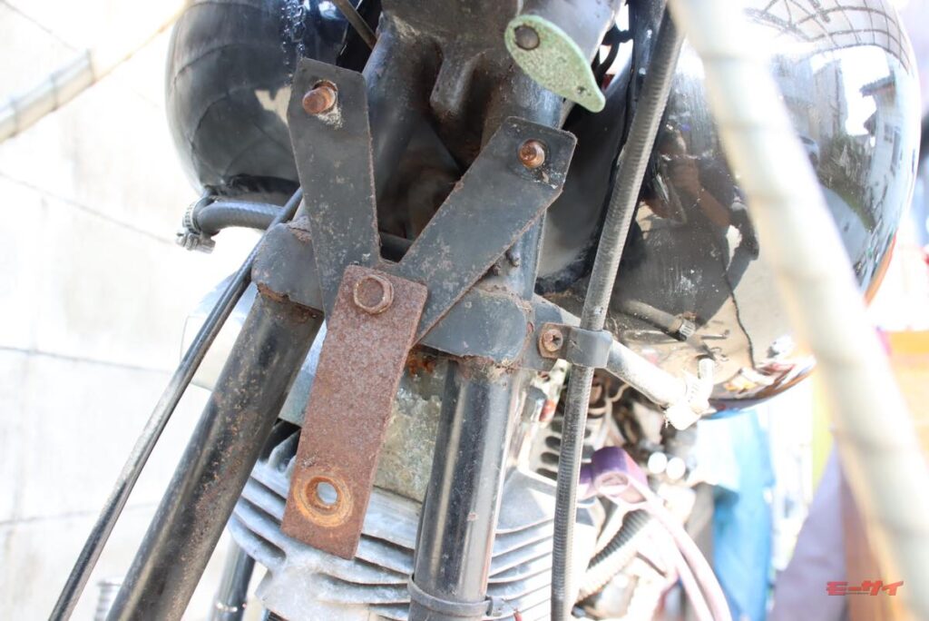 「これで錆を黒錆に転換させておけば、これ以上は赤錆にならずに落ち着くだろう」と塗りたくり、ステーはシルバーに塗ってから組立ててみました。ホーンとオイルクーラーを外した後で、フレームも錆やバリと落として角を丸めて滑らかに処理し、黒く補修塗装。良い気分になったところで、ホーンを仮留めしてみたんですよ。