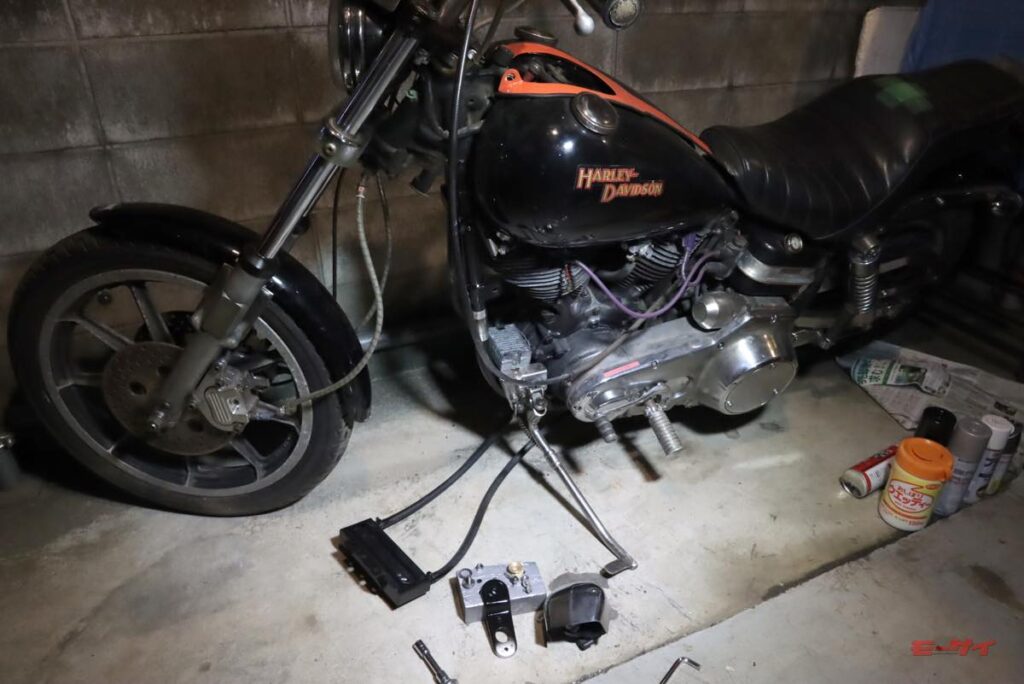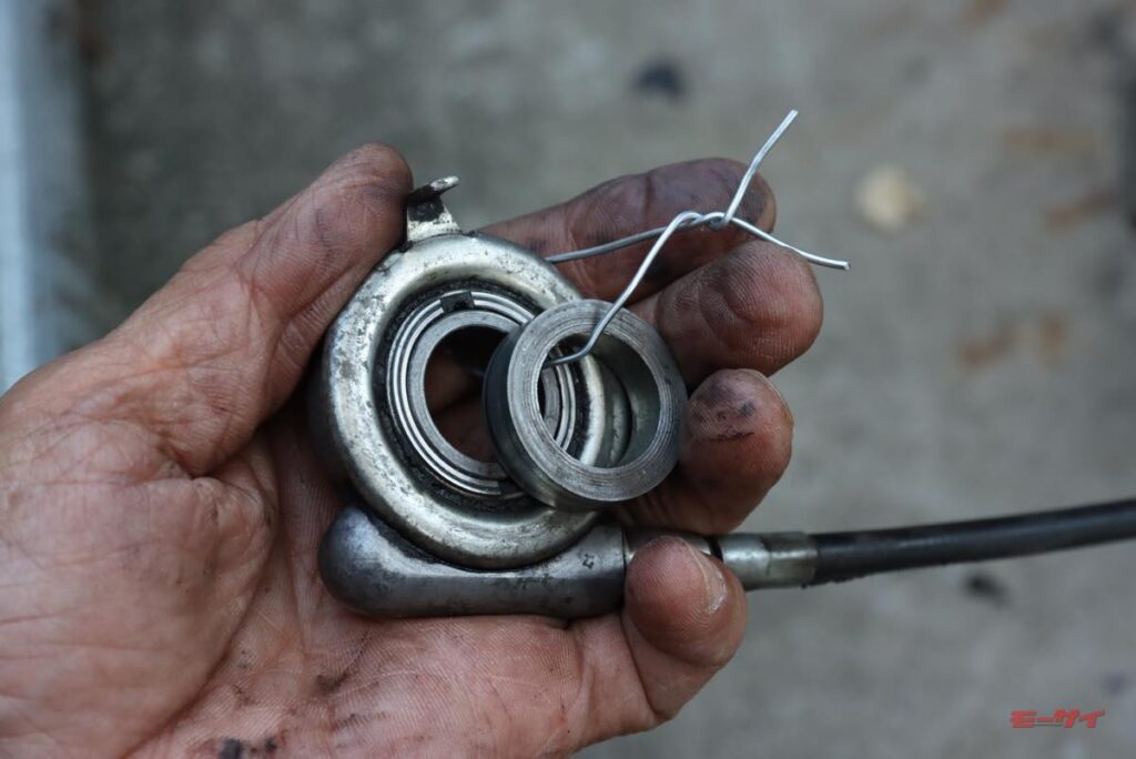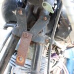フェンダーはオリジナルと違ったシンプルな形状なので楽に外せ、ホイールもあっさりと脱着完了。ただし、スピードメーターケーブルがホイール側に付く部分とどう分離出来るのかがこの時点では分からなかったため、宙ぶらりんで保持。