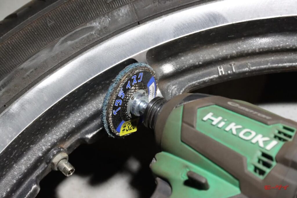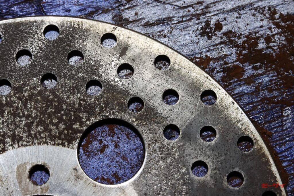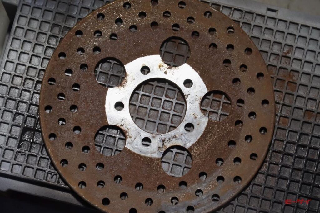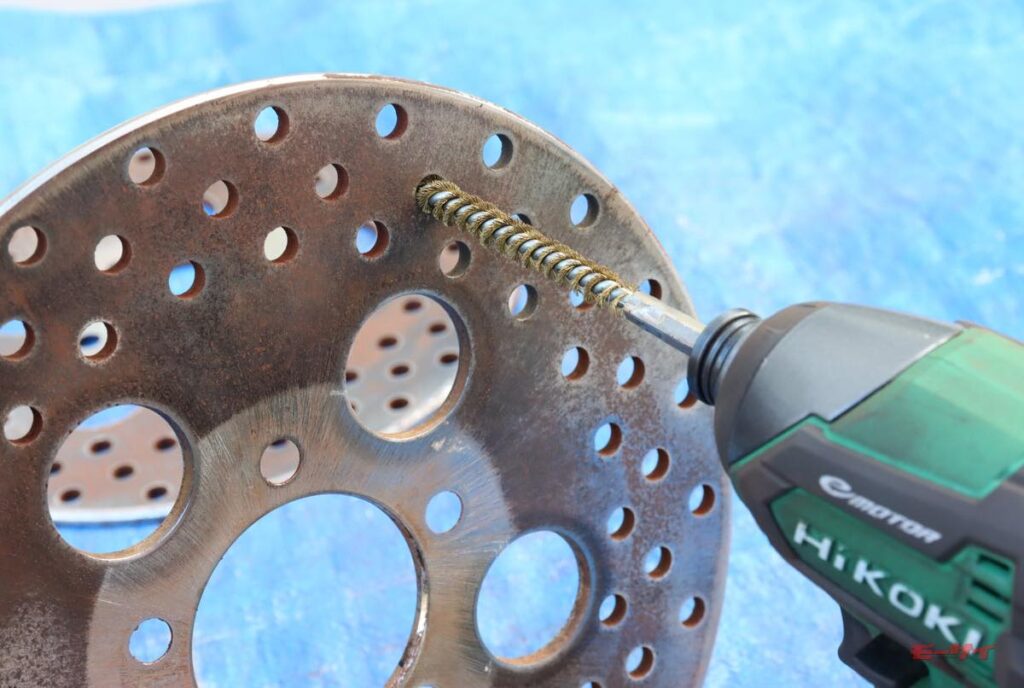 ともあれ、見事にサビサビになった左右のローターです。資金に余裕のある方なら迷わず新品に交換なさるでしょうし、そこまで思い切れない筆者も120番くらいでエイヤっと削りたい気分でしたが、ローターには使用限度のというものがあります。厚みを測ると、まだ少し使用限界まで余裕があります。そこで、ポリッシャーに240番のペーパーを付けて、下地の摩耗を最小限にするのを意識して研磨。そこそこ見れるようになったので、ローターの穴も真鍮ブラシを通して錆を落としました。