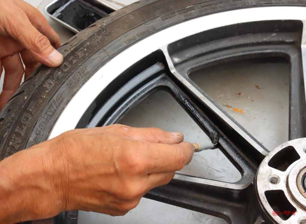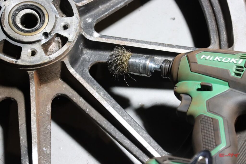 ポリッシャーやインパクトドライバーなど、職人さんスペックの電動工具は作業がはかどって便利です。とはいえ、ホイールの汚れとアルミの腐食を落として脱脂した後の黒の塗り直しは、手作業で進めました。ホイールのリブ部分のマスキングが大変そうだったのと、ザラザラ地肌の黒塗装部分は、薄めた塗料なら筆塗りでもムラが目立たないのが想像出来たからです。