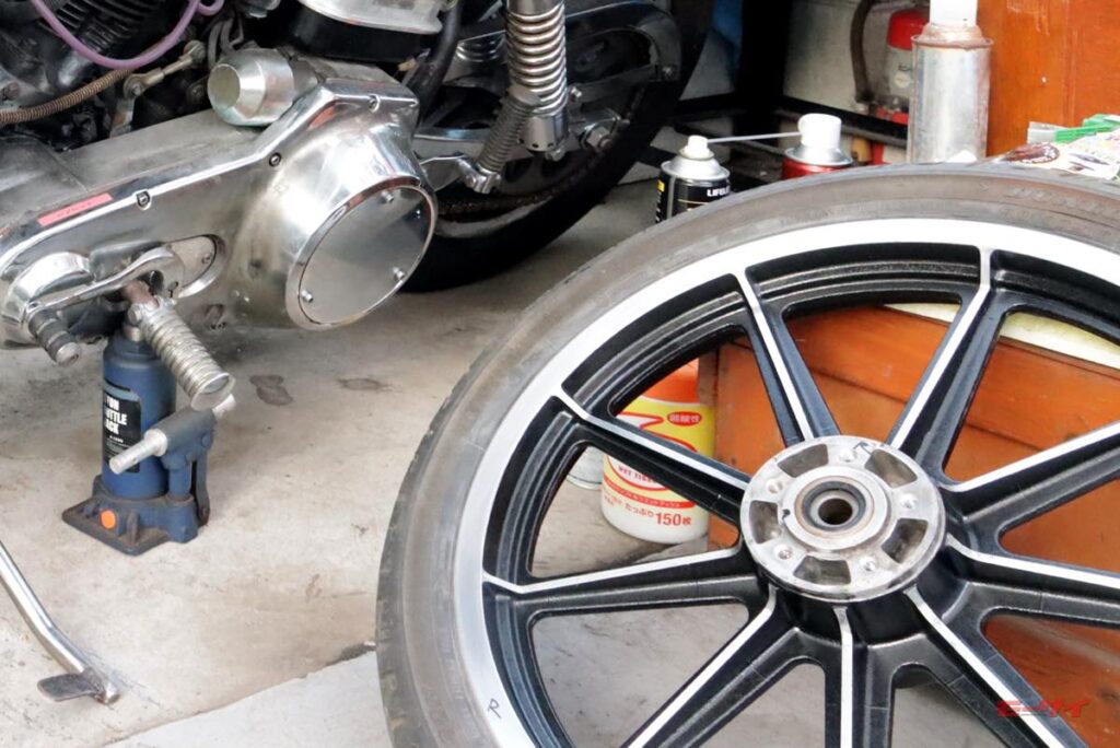 フォークの手入れは次に行うとして、キャリパーを外してホイール&ローターの清掃に取り掛かることにし、ジャッキアップと同時に落下防止措置として屋根の単管パイプからタイダウンを吊るしてハンドルに引っ掛け、軽くテンションをかけておきました。ホイールの清掃作業が日をまたぐ際には、サイドスタンドの根本にも5トンジャッキで支えを入れて、スタンド基部への荷重負担を減らす対策を講じておきました。
