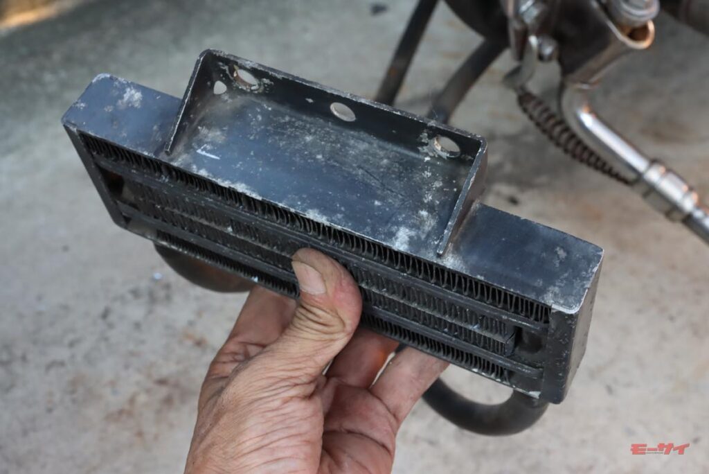 そうしたら、シルバーのステーが妙に気に入らなかったため、すぐさま黒に塗り直し。その数日後、改めて部品を取り付けてみたところで納得。めっき工場に出してクロームにすれば、こんな手間をかけなくても良かったんでしょうけど、そんな余裕はなかったし、錆は落とせるだけ落としておきたかったのです。また、この作業の合間に、ハゲハゲだったロックハート製みたいなオイルクーラーも黒の耐熱塗装を実施。一方、オイルホース類は現状の感じで亀裂はないので、エンジンの始動段階で漏れなければ一応ヨシと考えておきましょう。