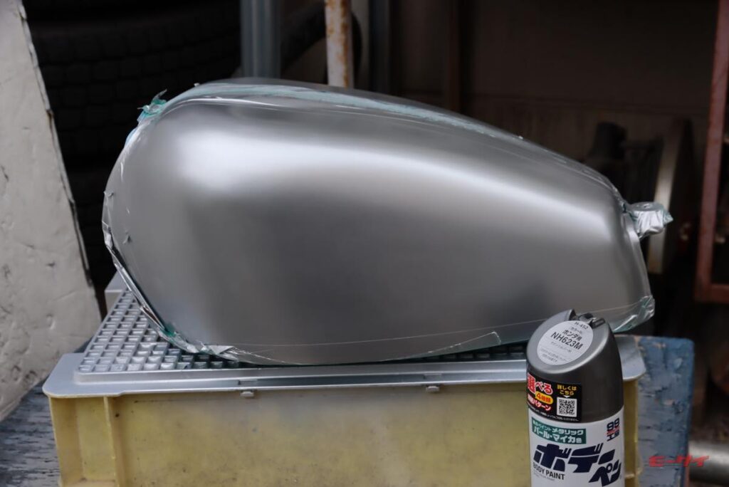 FRPのシート改造やタンクの造形までは終えたので、カー用品の定番スプレーで色を乗せ、仕上げは個人的に何度も使って信頼性を寄せているデイトナの耐ガソリンクリヤーでしっかりと保護します。
