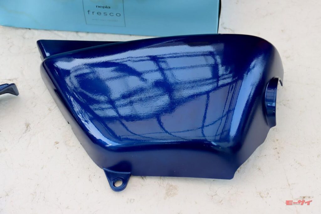 また、エイプのノーマルサイドカバーも、苔のような汚れを削ぎ落としてPPプライマーを吹いておきましたが、これは濃いめのブルーを採用し、敢えて目立たない暗色としました。これらが乾燥したら、600番~1000番のペーパーを軽~くかけ、天気の良い日に耐ガソリンクリヤーで仕上げ塗装を決行しました。